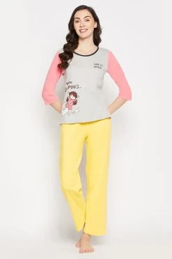 Quirky Quotes Colourblocked Top In Grey & Chic Basic Pyjama In Yellow – 100% Cotton