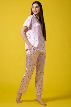 Flamingo Print Button Down Shirt & Pyjama Set In Soft Pink – Satin