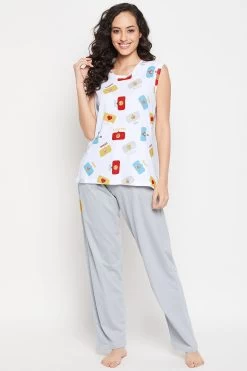 Emoji Print Top In White & Chic Basic Pyjama In Grey – 100% Cotton