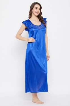 This 4pc satin nightwear is FREESIZE in stretchable poly-knit satin fabric. It makes a great gift set with its excellent drape, smooth feel and shiny lustre. Finished with a cute lace trim.