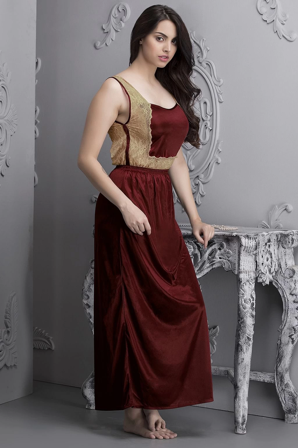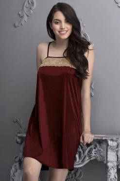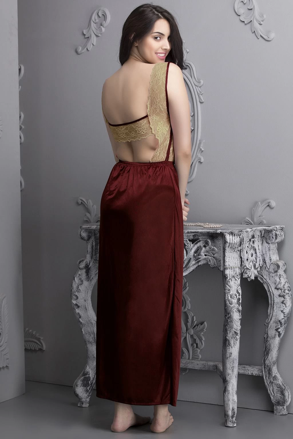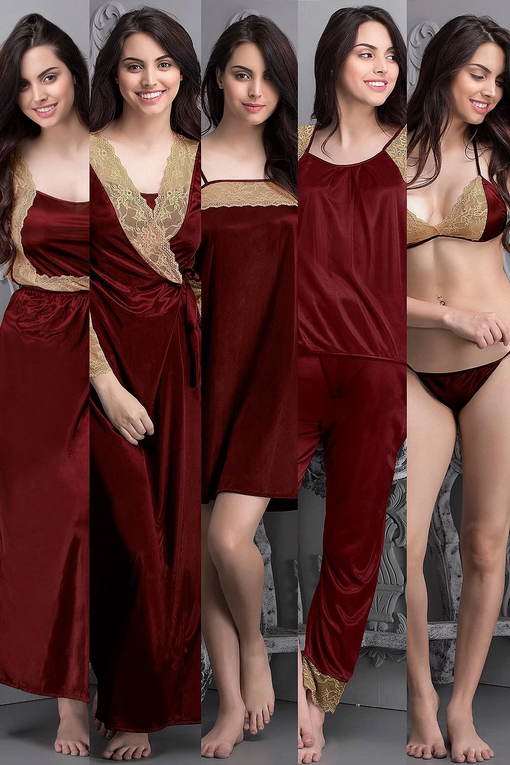 With its amazing drape, smooth fabric and shiny look, the seven-piece satin nightwear set is available in maroon colour and includes: 1. A cold-shoulder top featuring lace sleeves 2. A pyjama with hems decorated with lace panels 3. A sleeveless nighty adorned with lace overlays 4. A robe with tie-up detail and lace panels 5. A short spaghetti nighty with a lacy neckline 6. A lacy halter bra that has non-wired and non-padded cups 7. A tie-up low waist bikini.