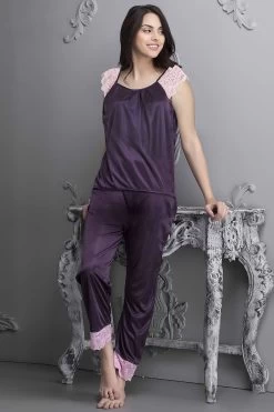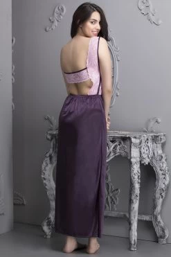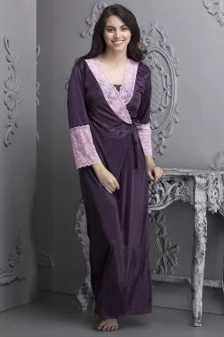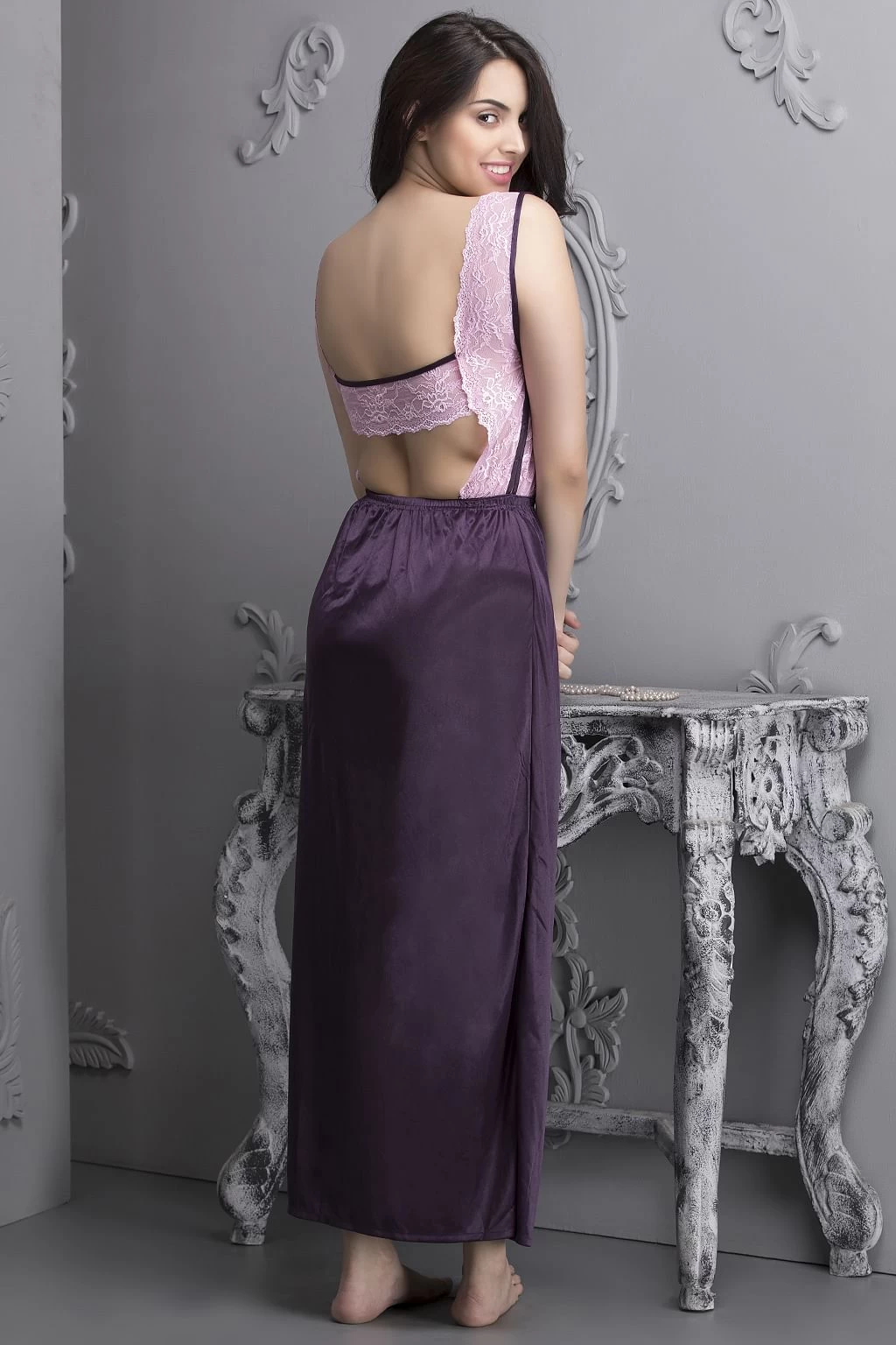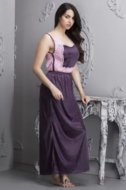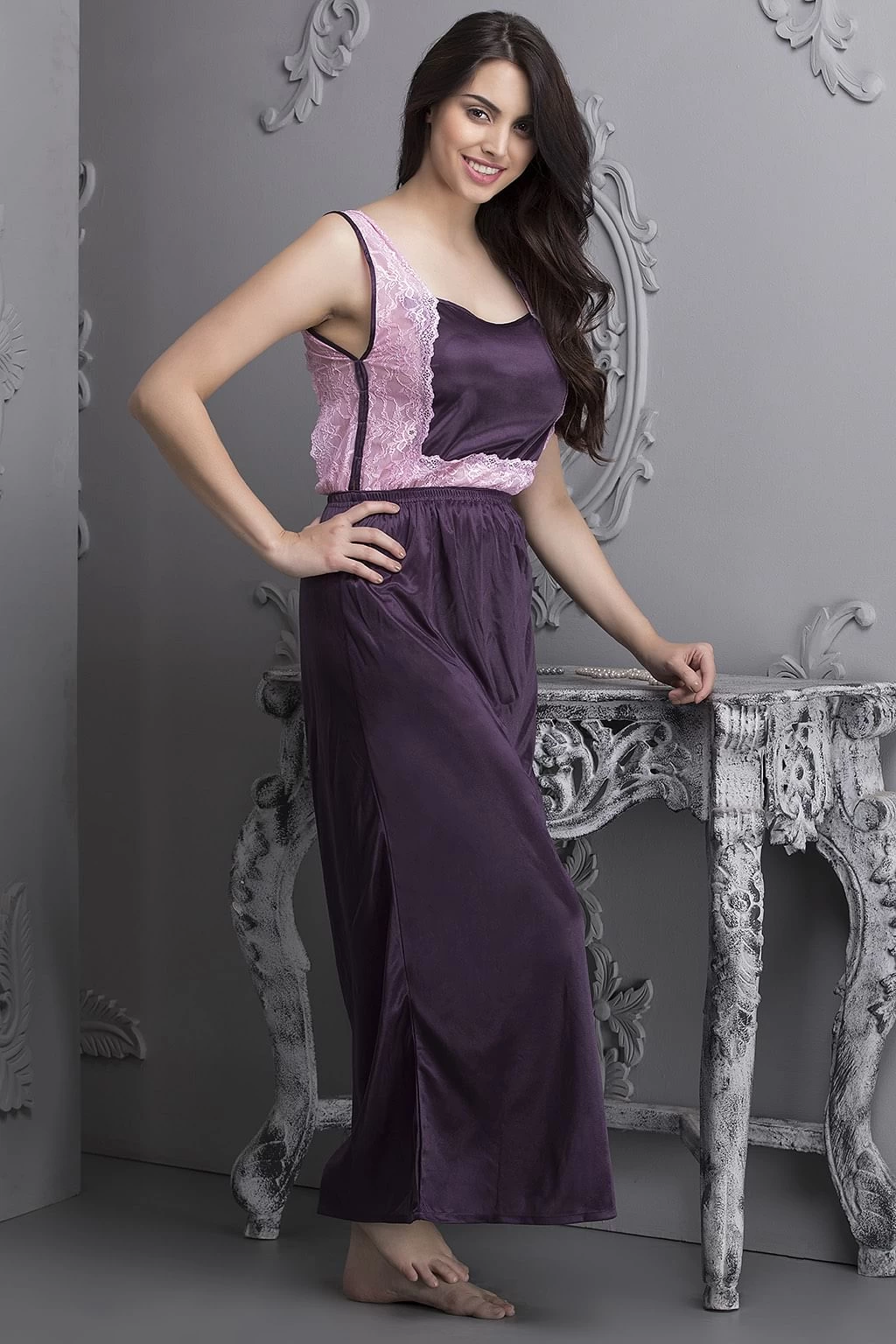 This is a seven-piece satin nightwear set which offers complete comfort while maintaining style. The nightwear is made from stretchable poly-knit satin fabric, which gives you second-skin feel. The set comprises a long nighty, long robe, top, full-length pyjama, short nighty and a matching string bra brief set. The attire is perfect if you are planning a honeymoon trip. The set offers outstanding drape, soft feel and shiny lustre. The set is attached with a cute contrast lace trim. It has a piece for every mood and occasion.