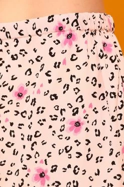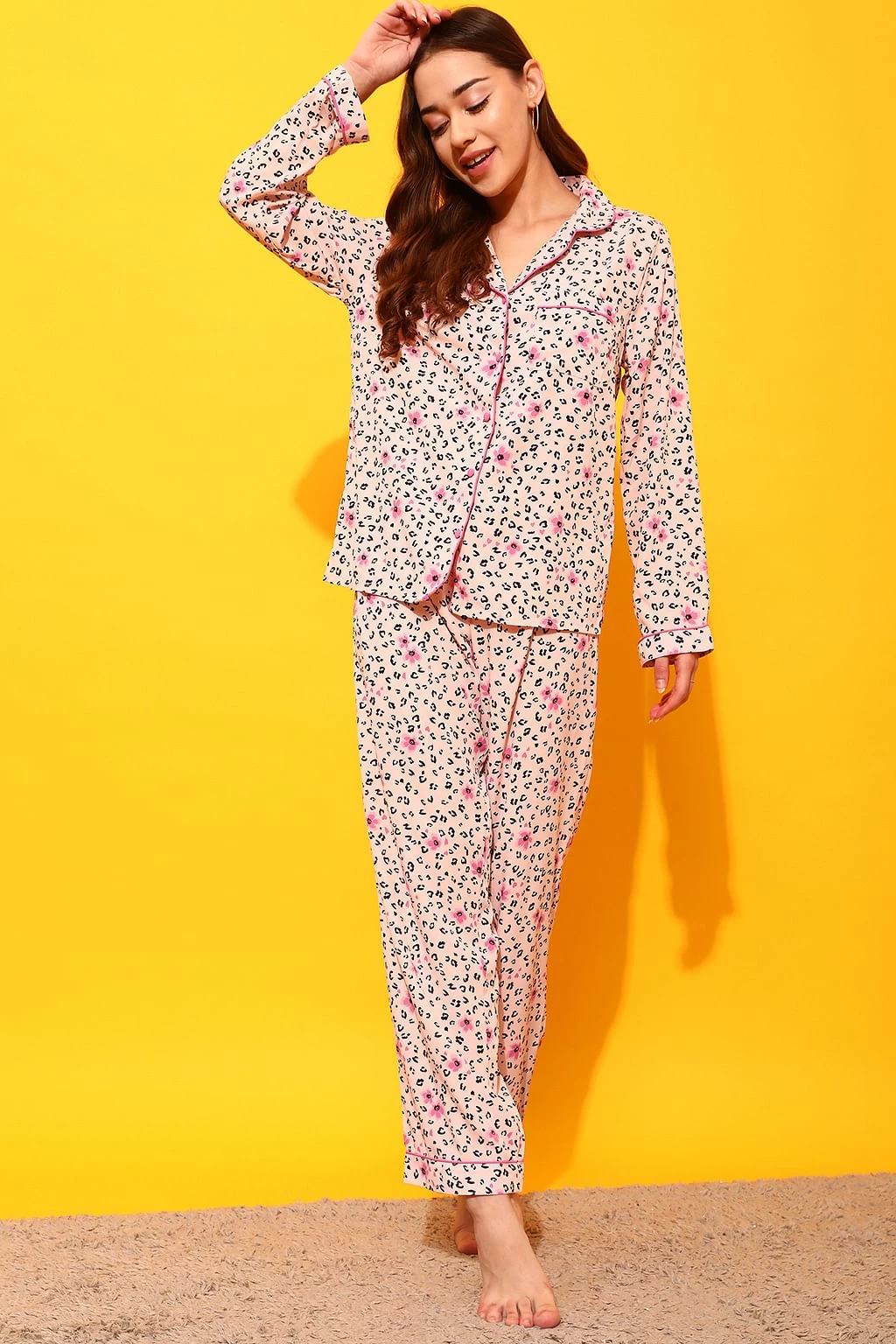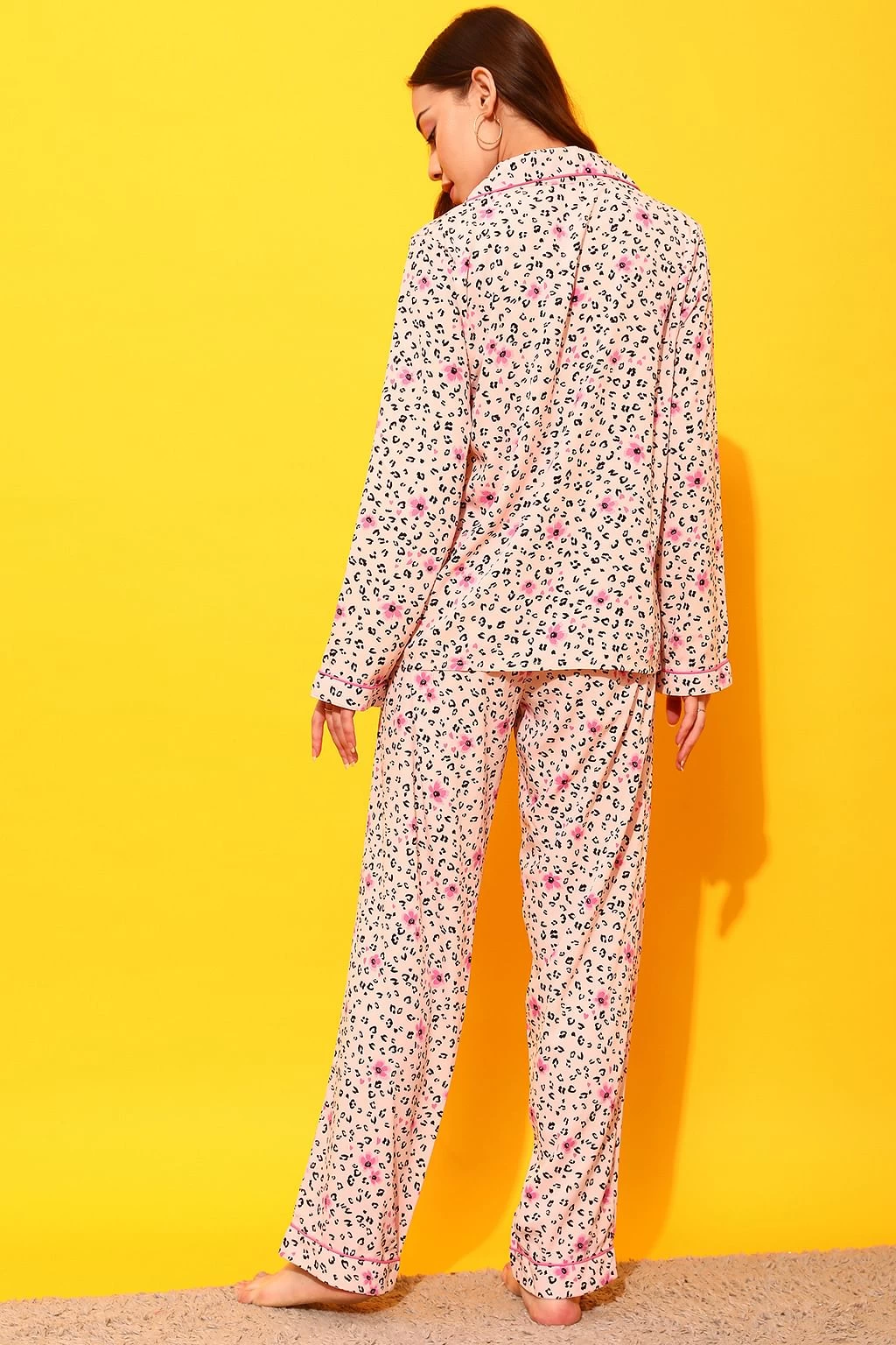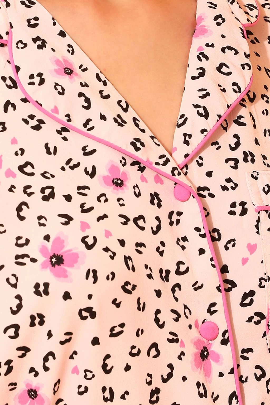 Animal Print Button Down Shirt & Pyjama Set In Light Pink – Satin