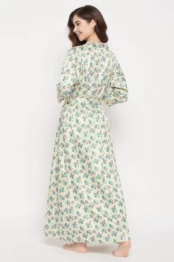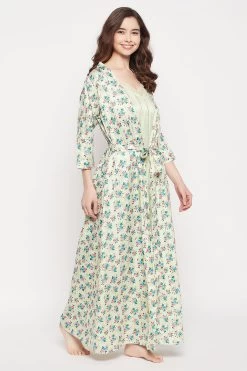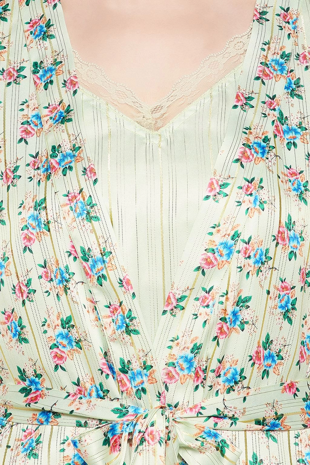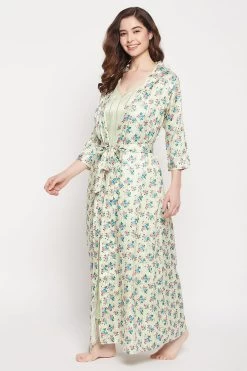 Chic Basic Long Night Dress & Pretty Florals Robe In Sage Green – Satin