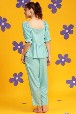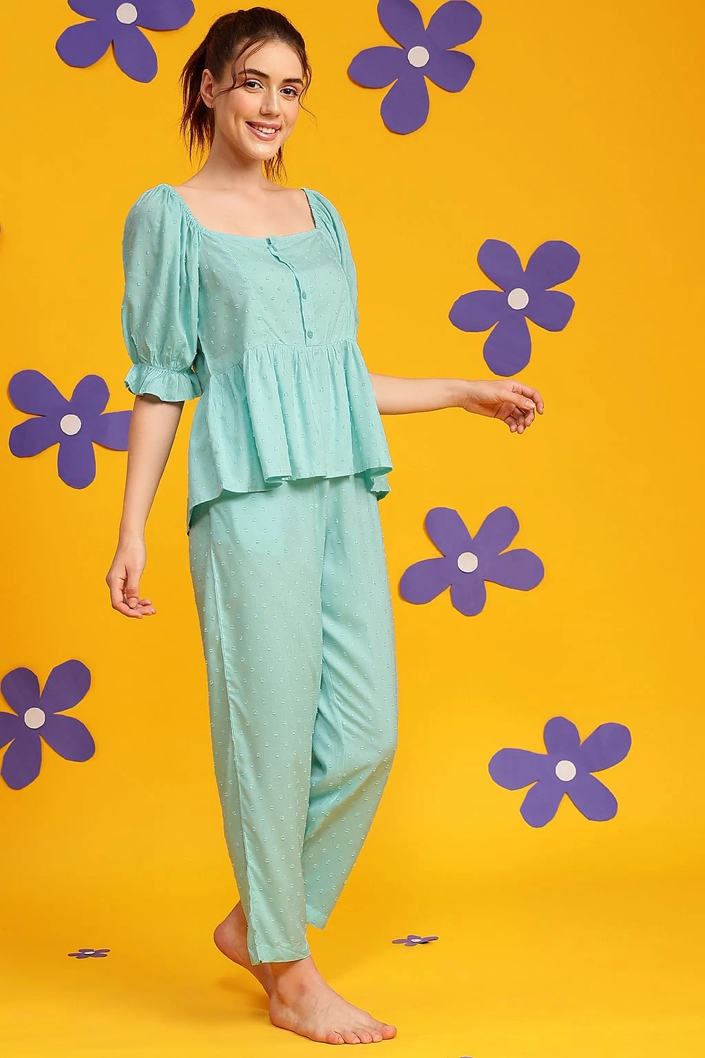 Chic Basic Peplum Top & Pyjama Set In Sky Blue – Rayon