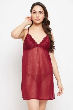 Maroon robe & nighty set crafted with smooth georgette fabric.