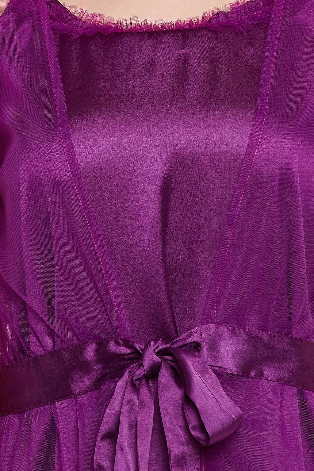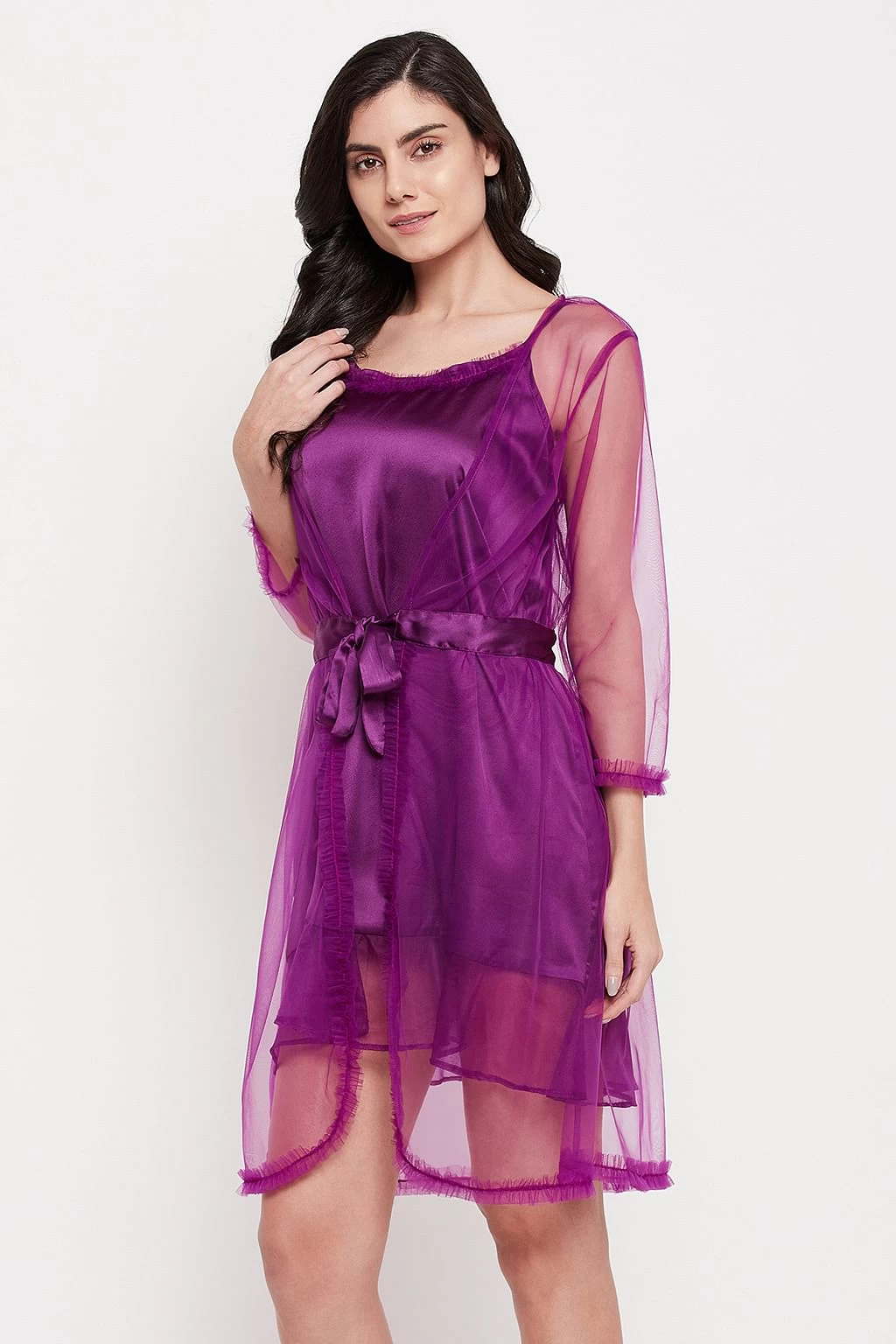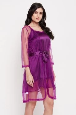 Purple short night dress and robe set crafted with luxurious satin fabric.