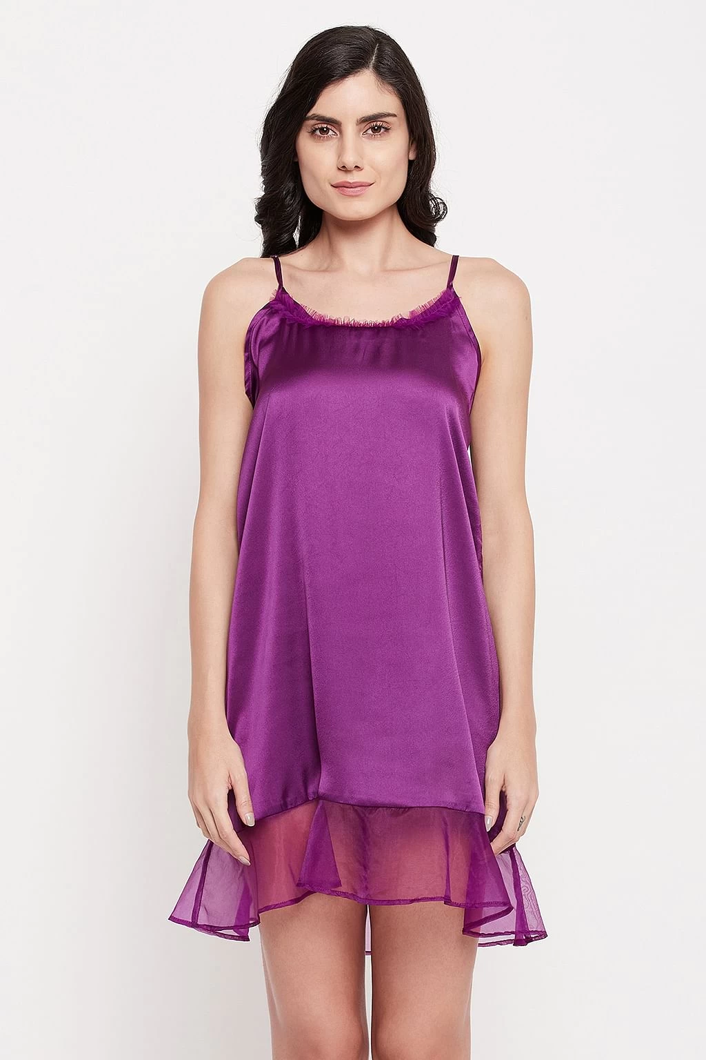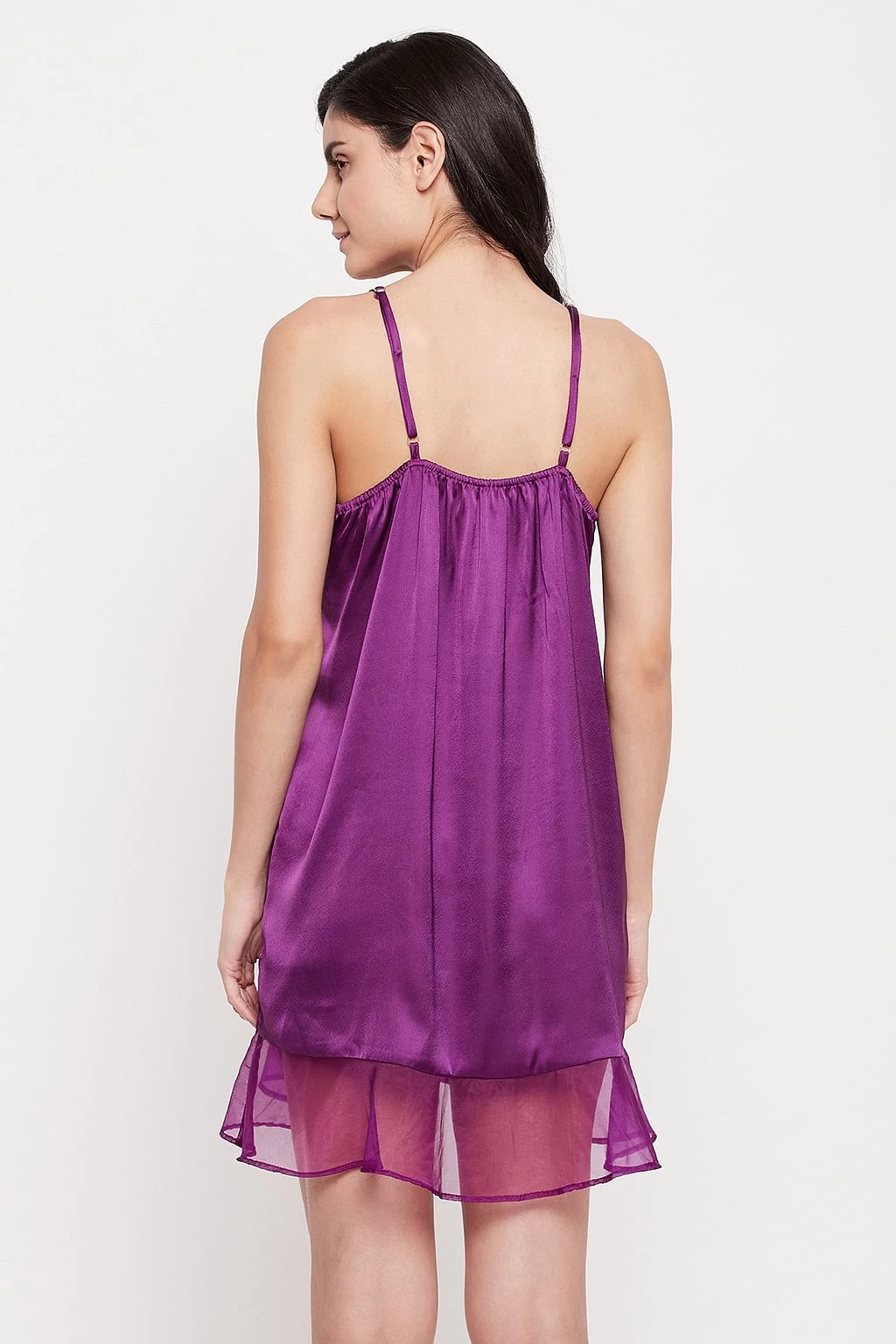 Night dress has a round neckline & adjustable spaghetti straps.