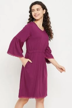 Has a round neckline, 3/4 flared sleeves and an elasticated waistline.