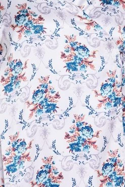 Floral print robe has 3/4th sleeves with mesh inserts.