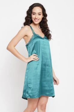 Sleeveless nighty has a lace-embellished V-neckline.