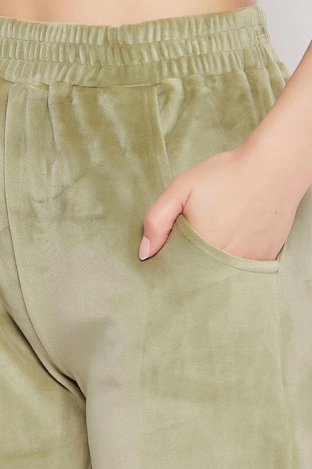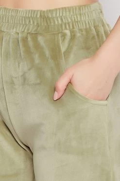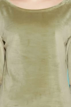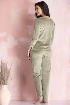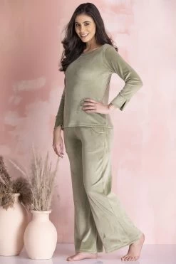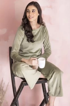 Olive green top & pyjama set crafted with soft & cosy velour fabric.