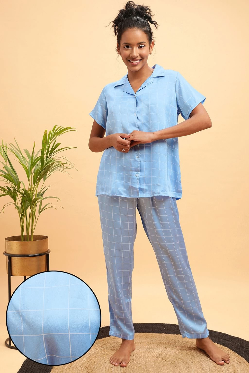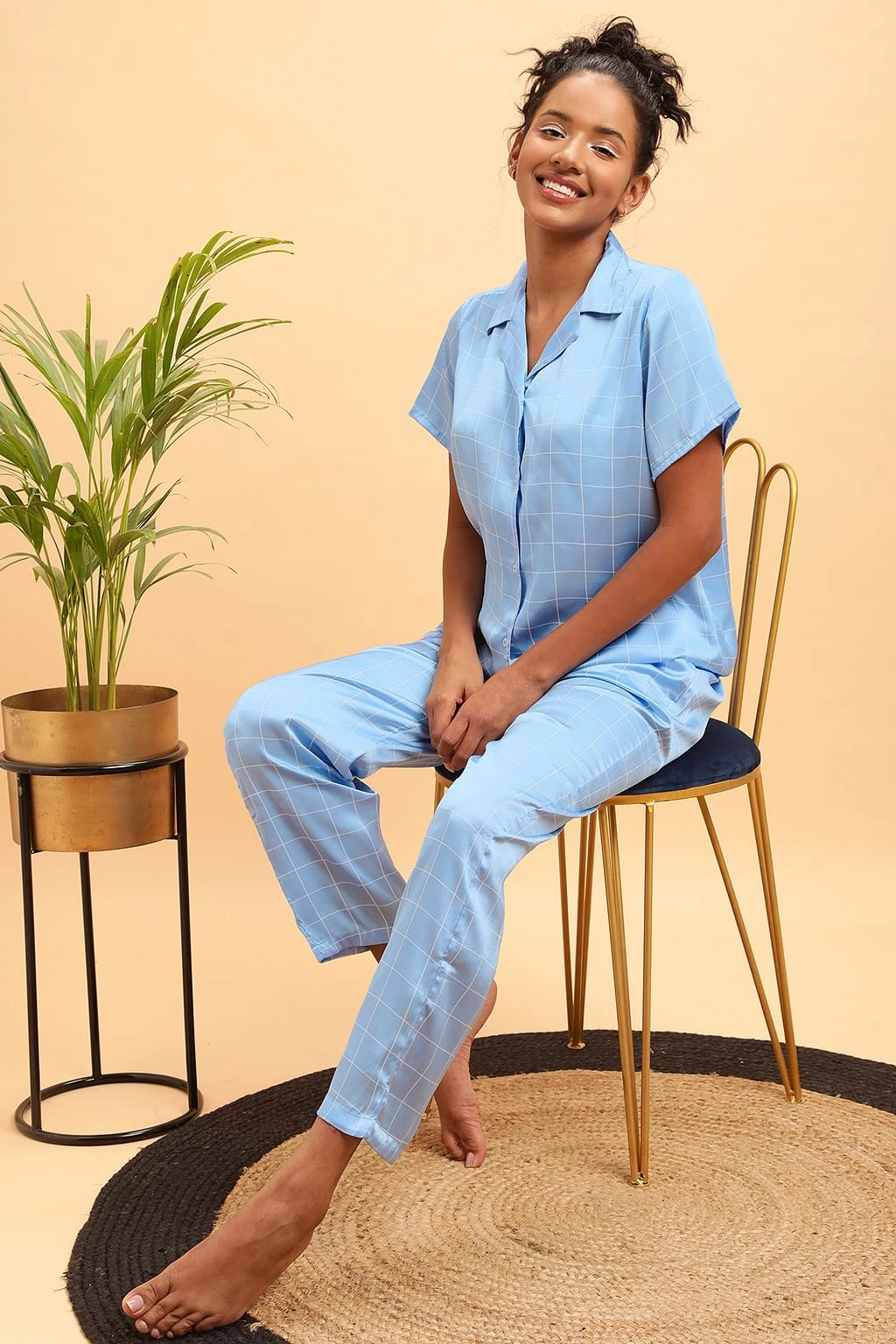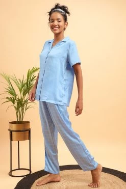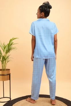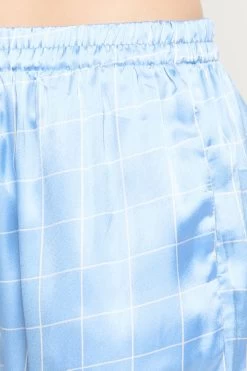 Classic Checks Button Down Shirt & Pyjama Set In Sky Blue – Satin