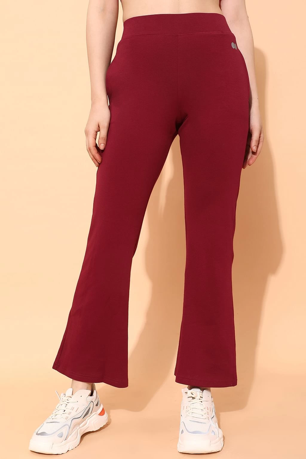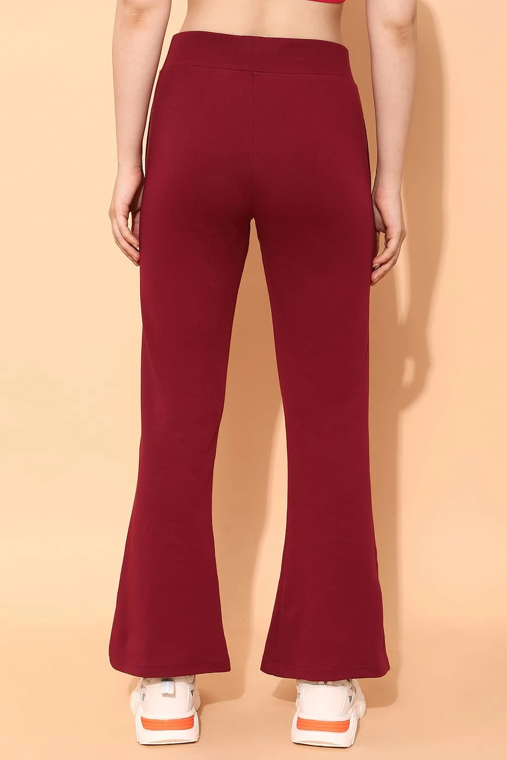 Maroon high waist flared yoga pants crafted with cotton rich fabric with spandex.