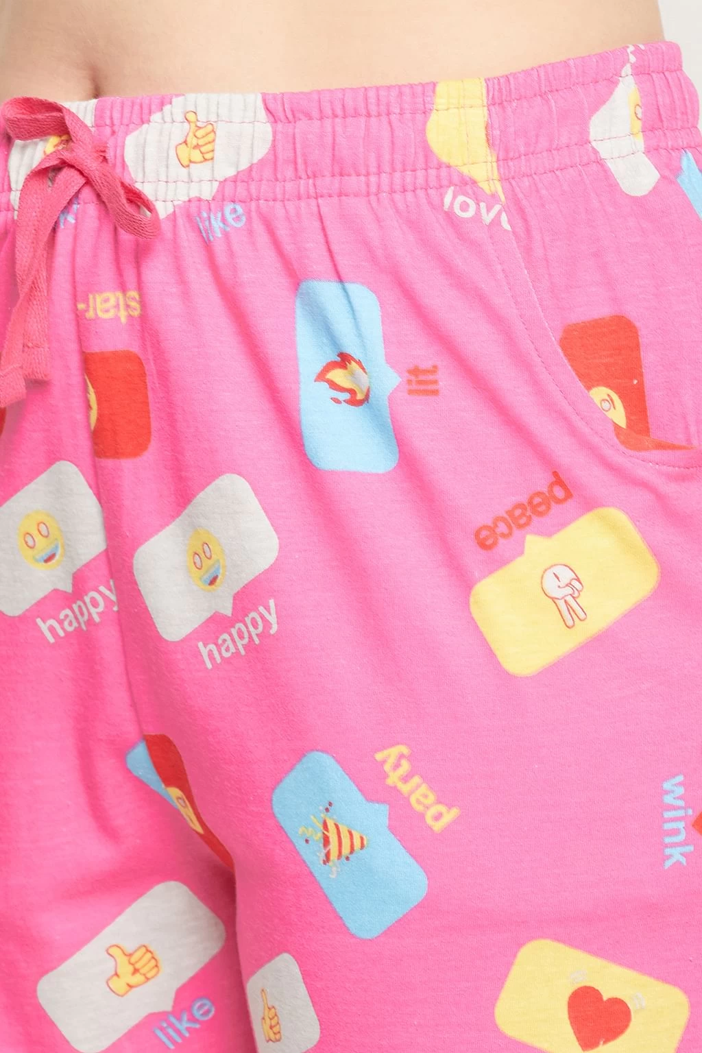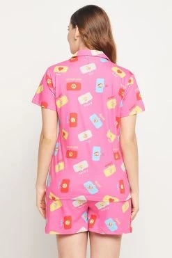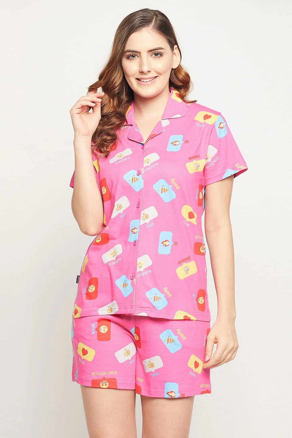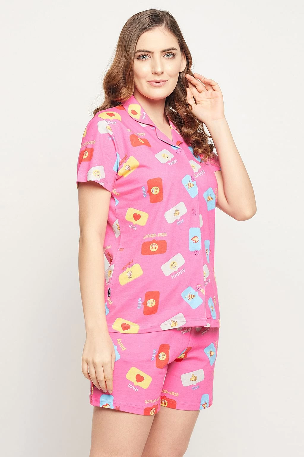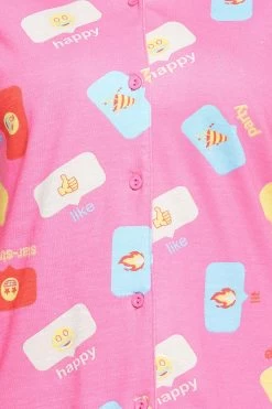 Emoji Print Button Down Shirt & Shorts Set In Pink – 100% Cotton