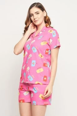 Pink button down shirt & shorts set crafted with soft & premium 100% cotton fabric.