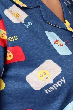 Emoji Print Button Down Shirt & Shorts Set In Royal Blue – 100% Cotton