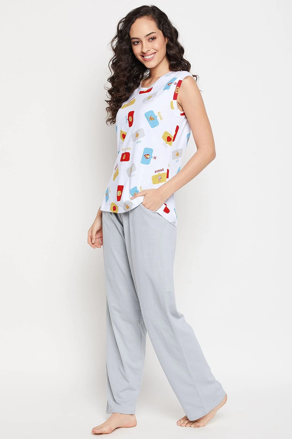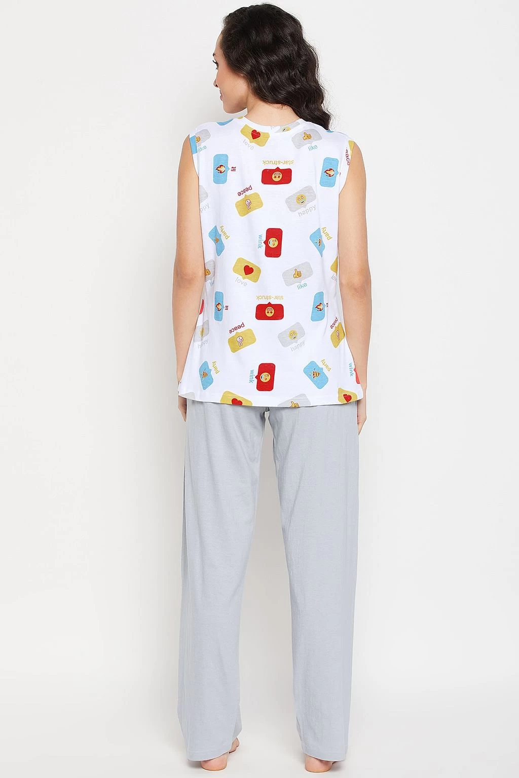 Emoji Print Top In White & Chic Basic Pyjama In Grey – 100% Cotton