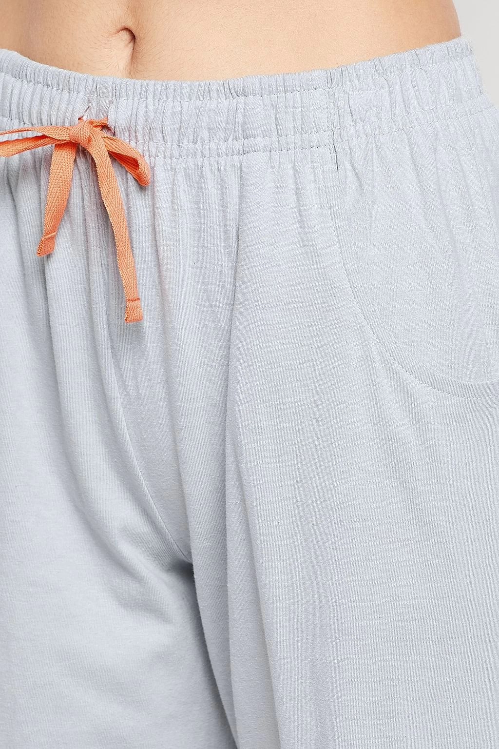 Grey pyjama has an elasticated waistband & drawstring fastening for snug fit.
