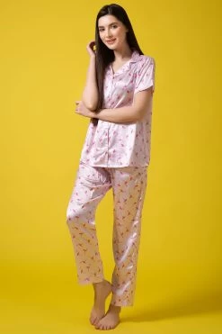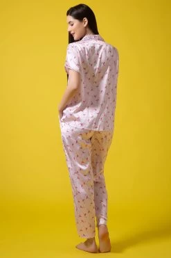 Flamingo Print Button Down Shirt & Pyjama Set In Soft Pink – Satin