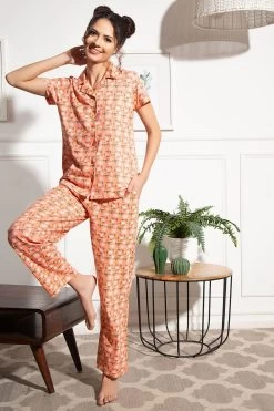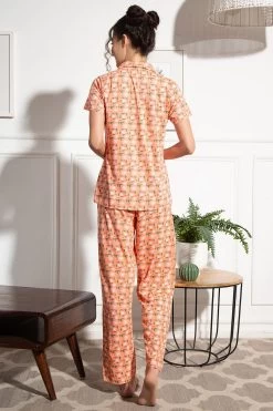 Peach coloured button-down shirt & pyjama set crafted with soft & premium 100% cotton fabric.