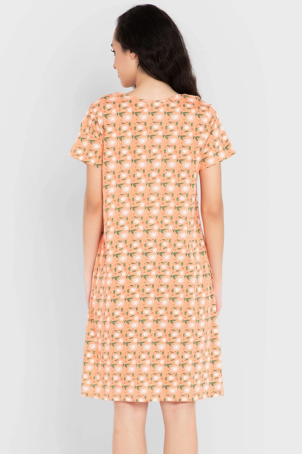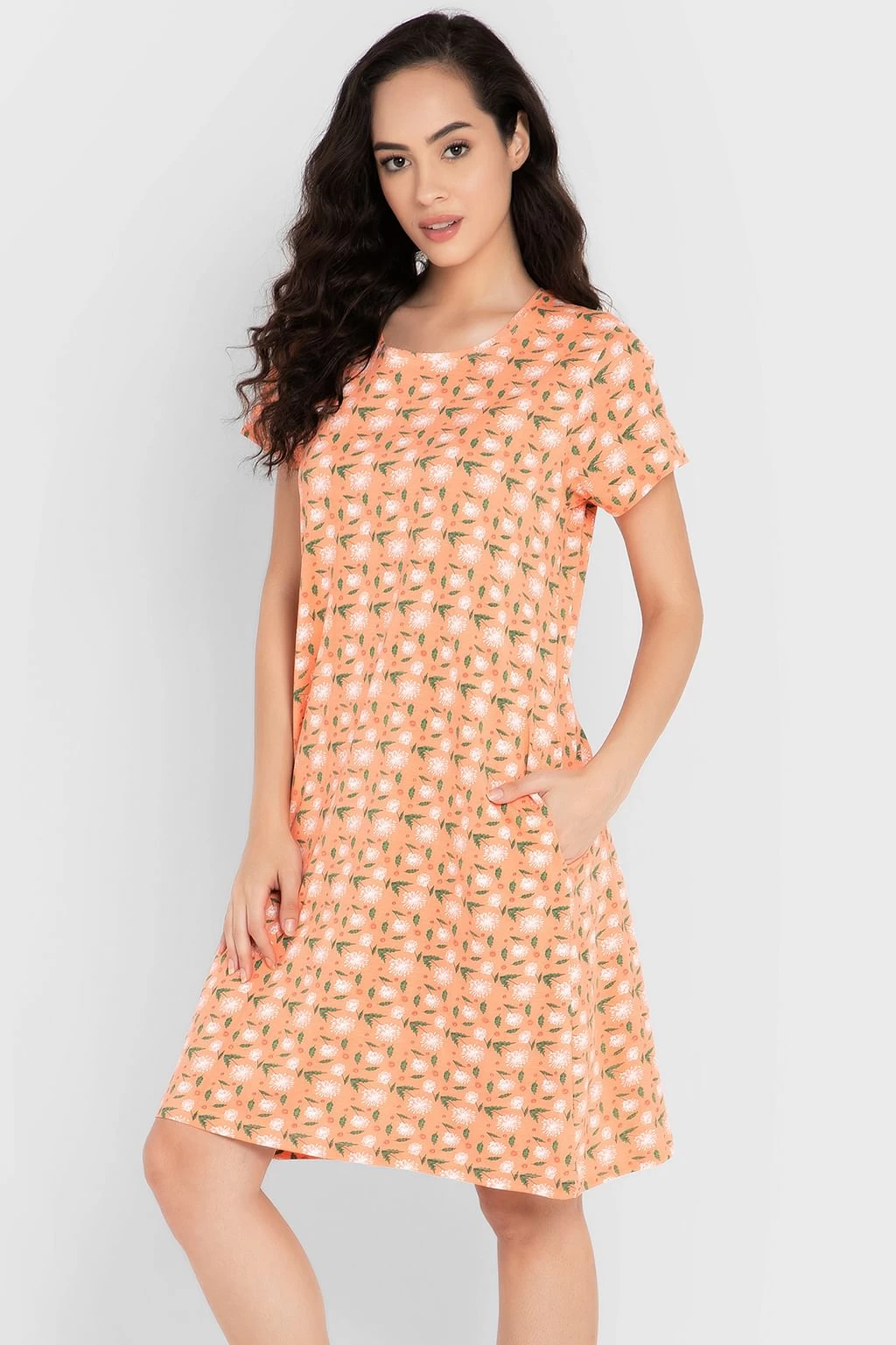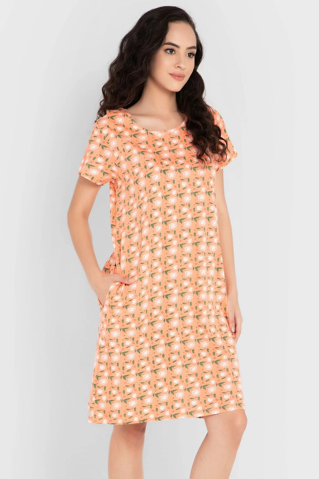 Floral Print Short Night Dress In Peach Colour – 100% Cotton