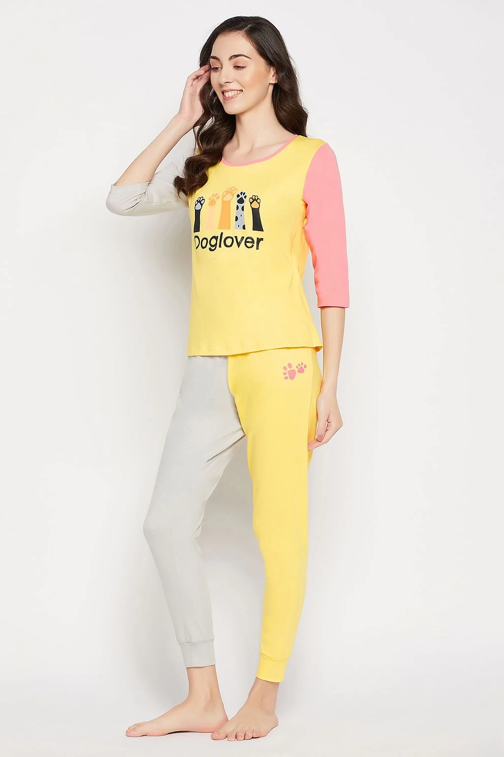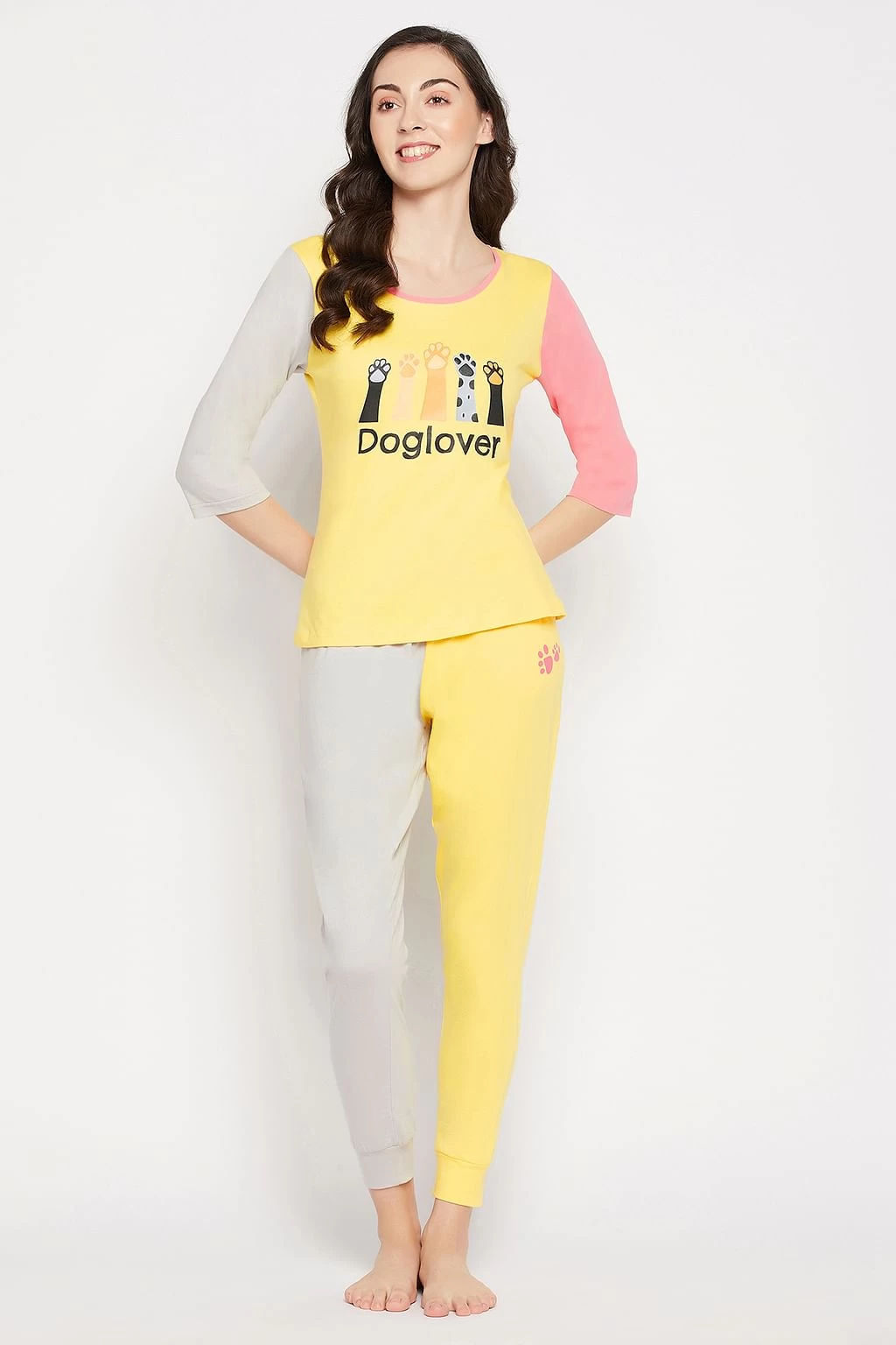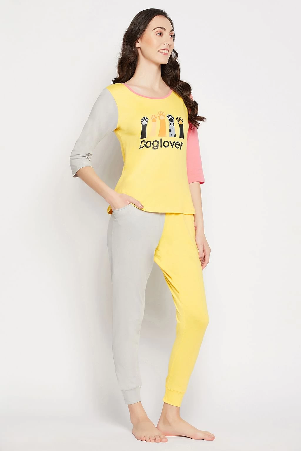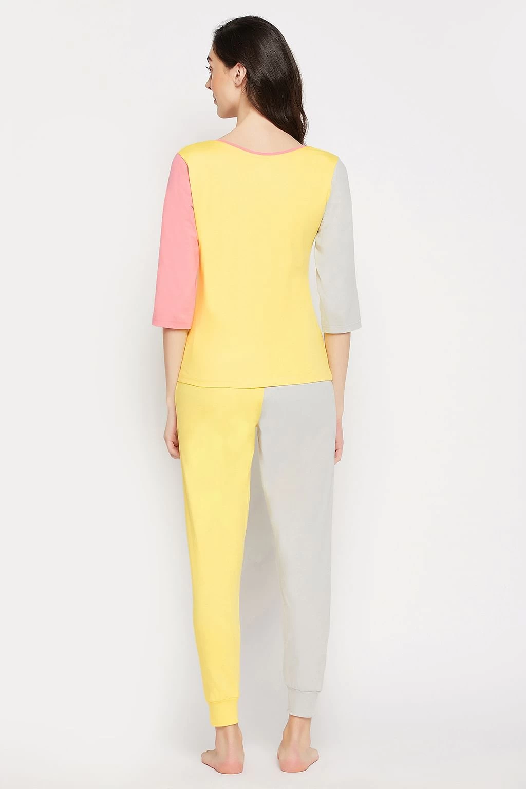 Graphic & Text Print Colourblocked Top & Joggers Set In Yellow – 100% Cotton