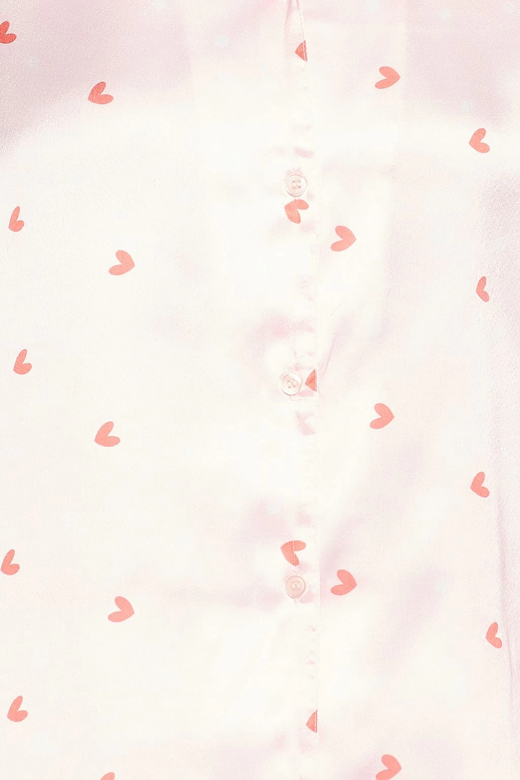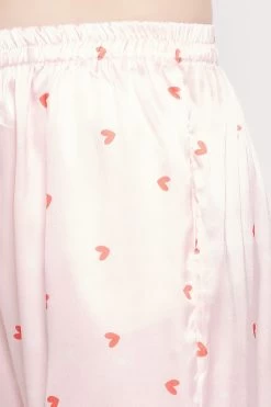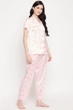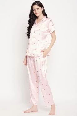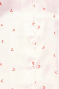 Heart Print Button Down Shirt & Pyjama Set In Soft Pink – Satin