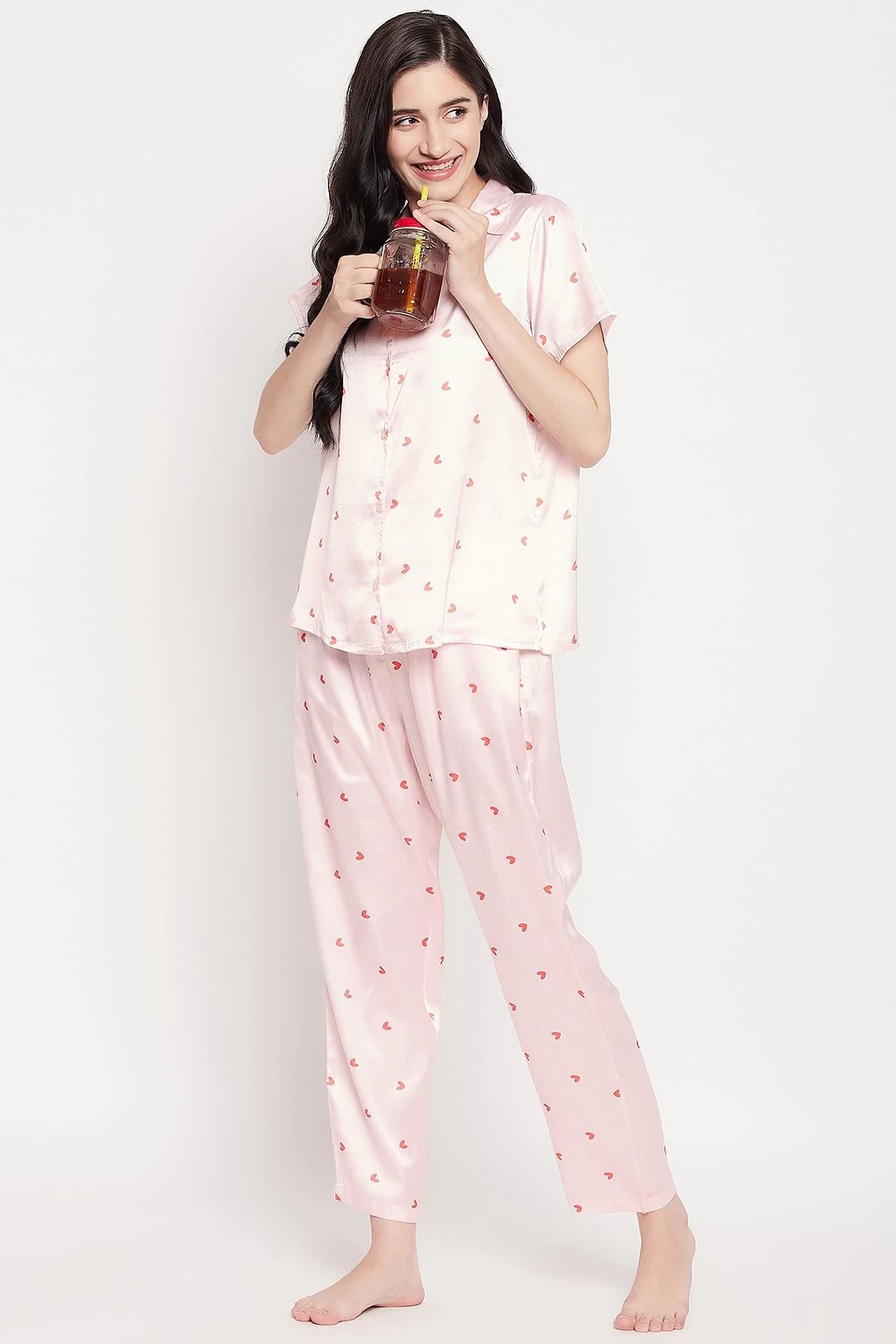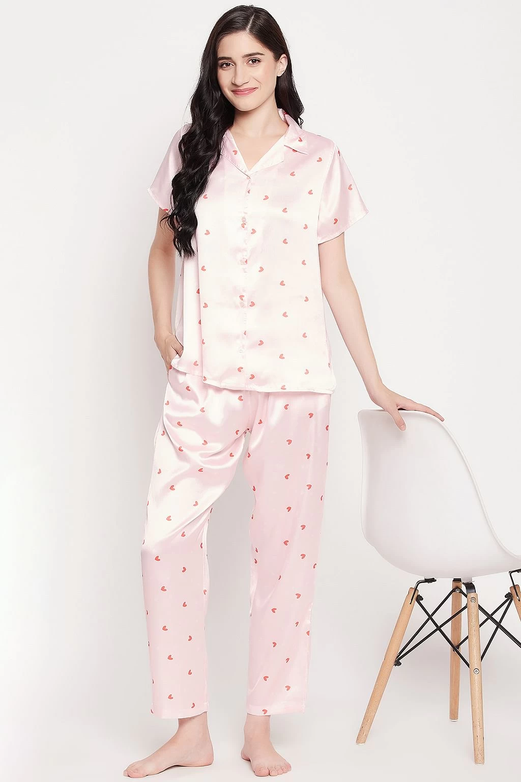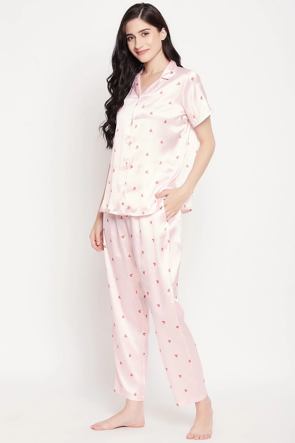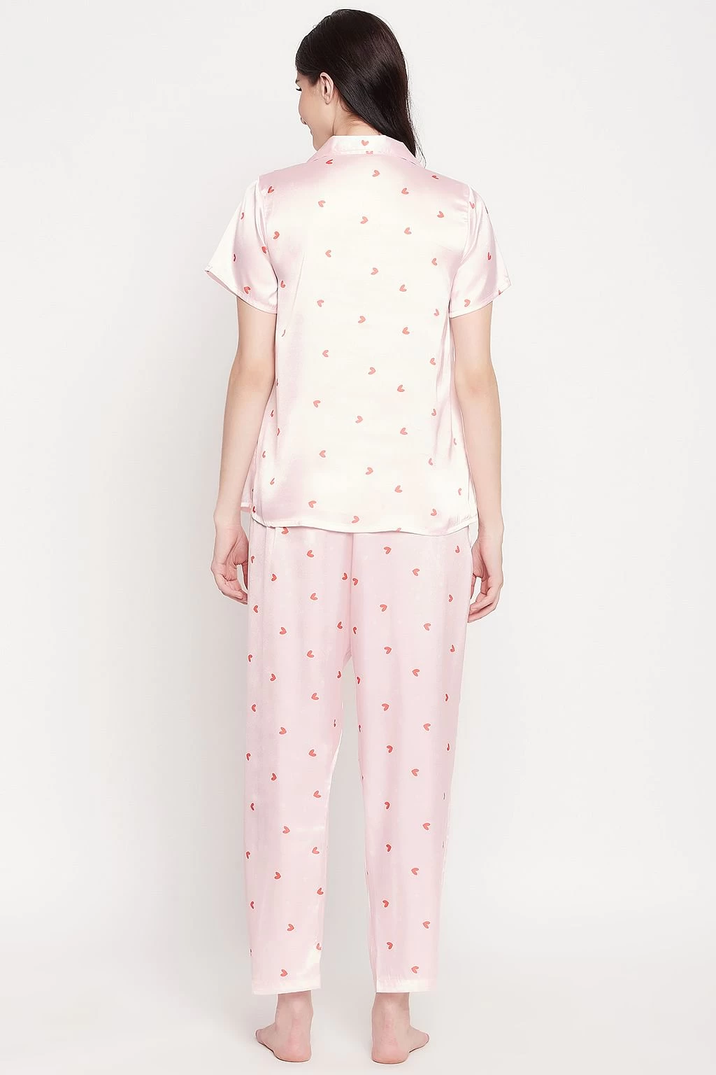 Be the first to review “Heart Print Button Down Shirt & Pyjama Set In Soft Pink – Satin” Cancel reply