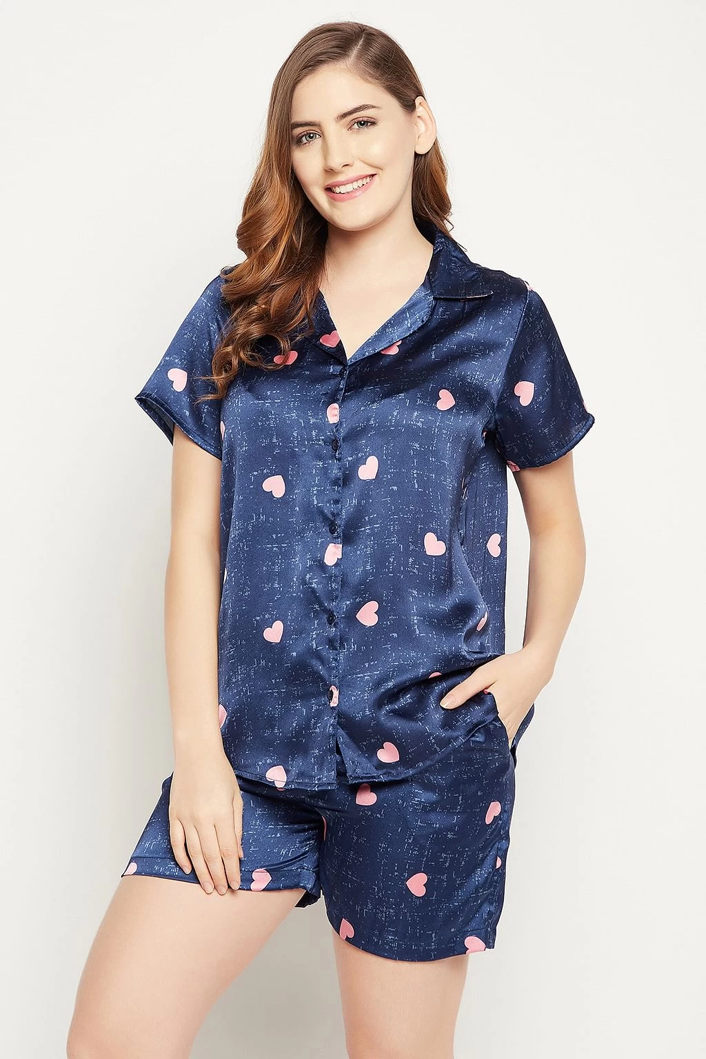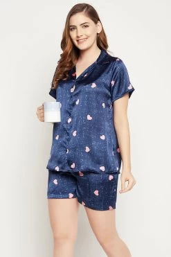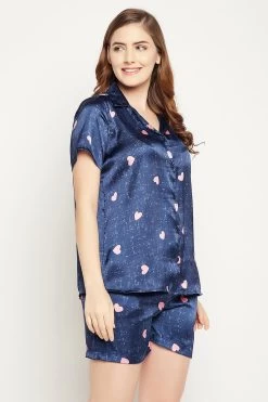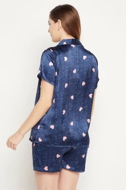 Navy blue button-down shirt & shorts set crafted with butter-soft satin fabric.
