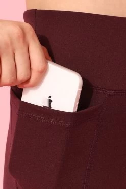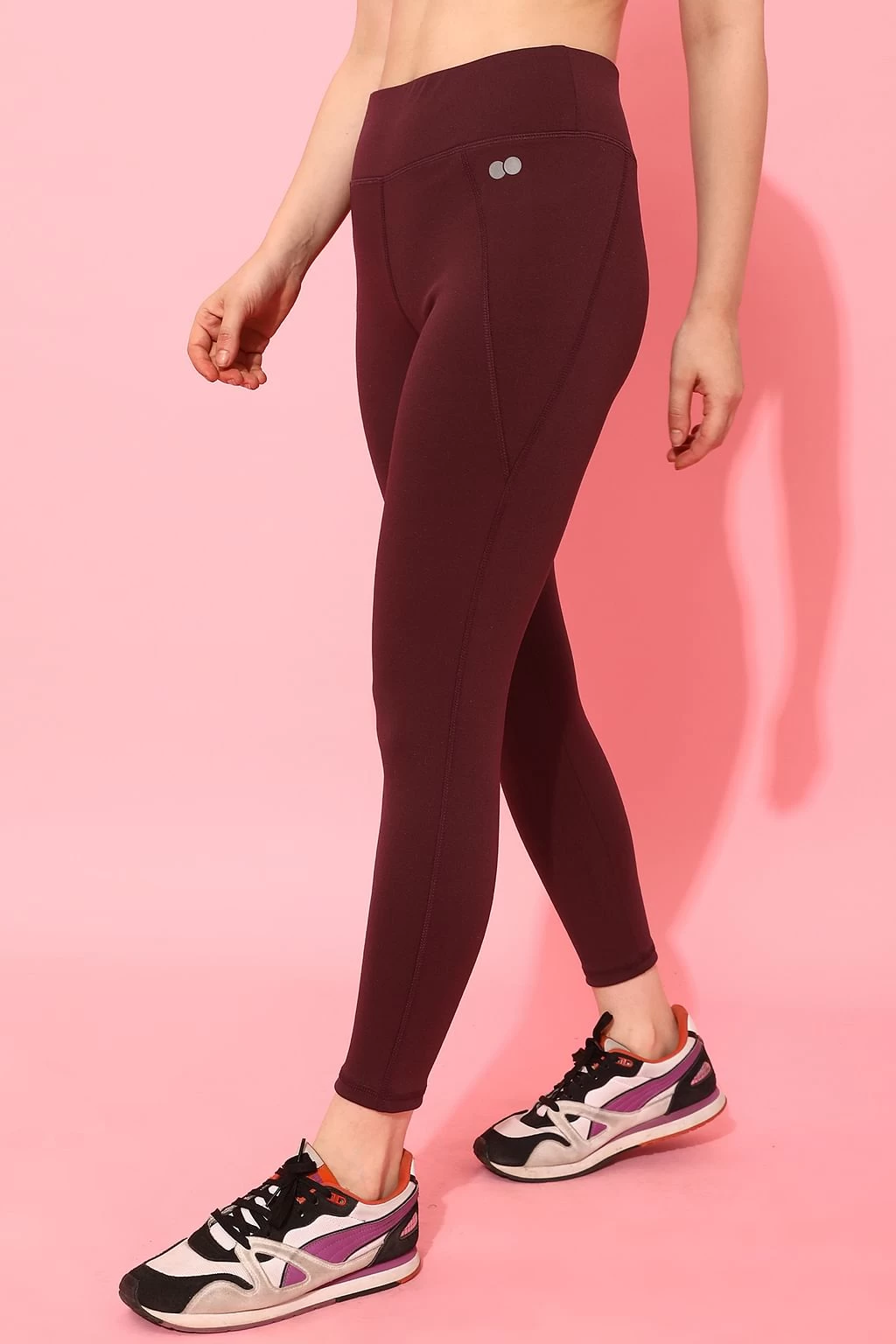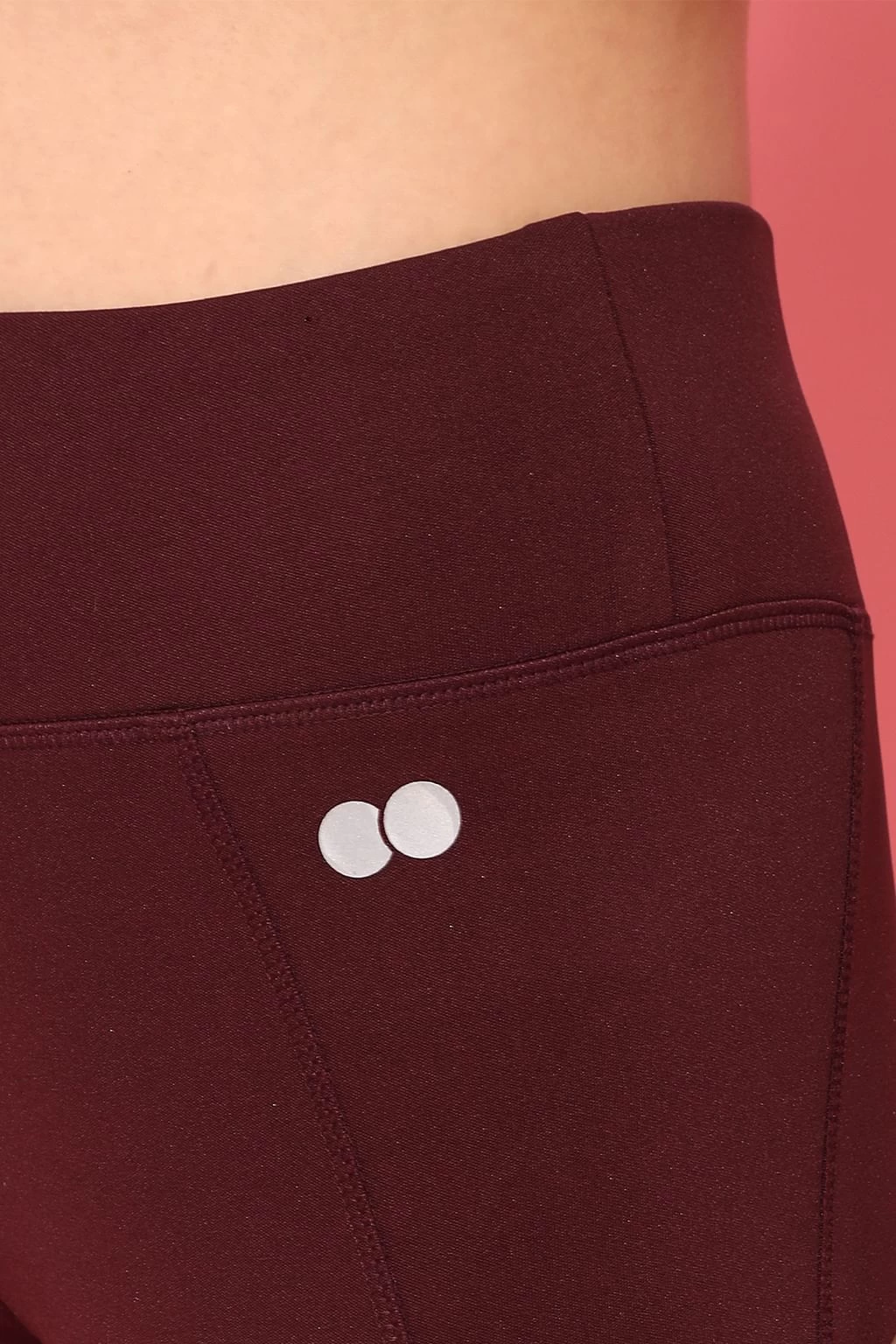 Maroon high waist active tights crafted with soft poly-spandex fabric.