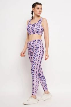 Medium Impact Padded Printed Active Sports Bra & High Rise Active Tights With Side Pocket In Purple