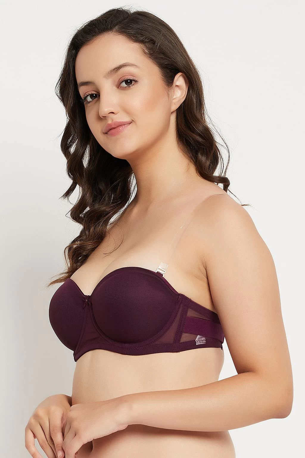 Invisi Padded Underwired Full Cup Strapless Balconette Bra In Wine Colour With Transparent Straps And Band