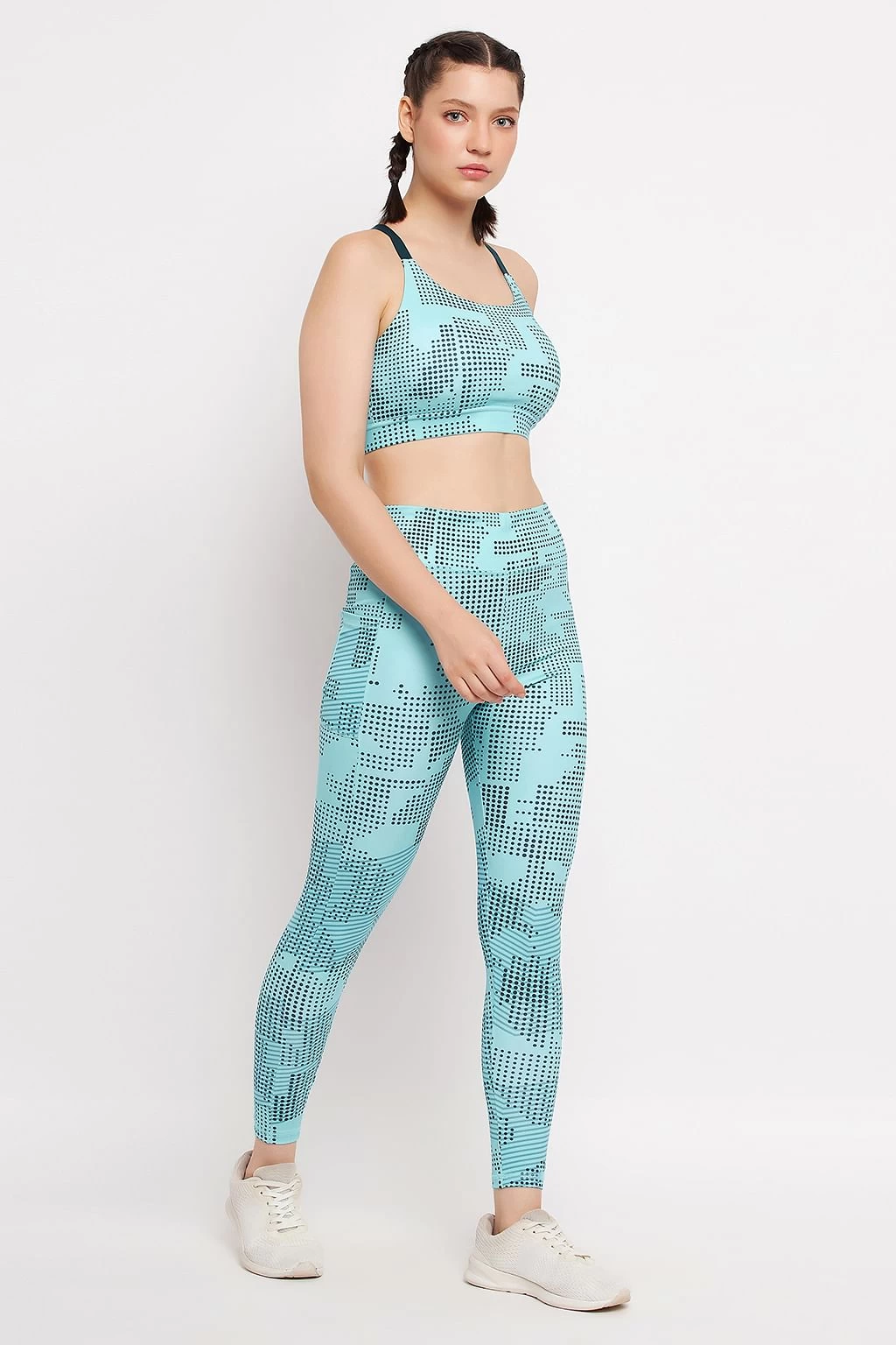 Be the first to review “Medium Impact Padded Printed Sports Bra & High Rise Active Tights With Side Pocket In Sky Blue” Cancel reply