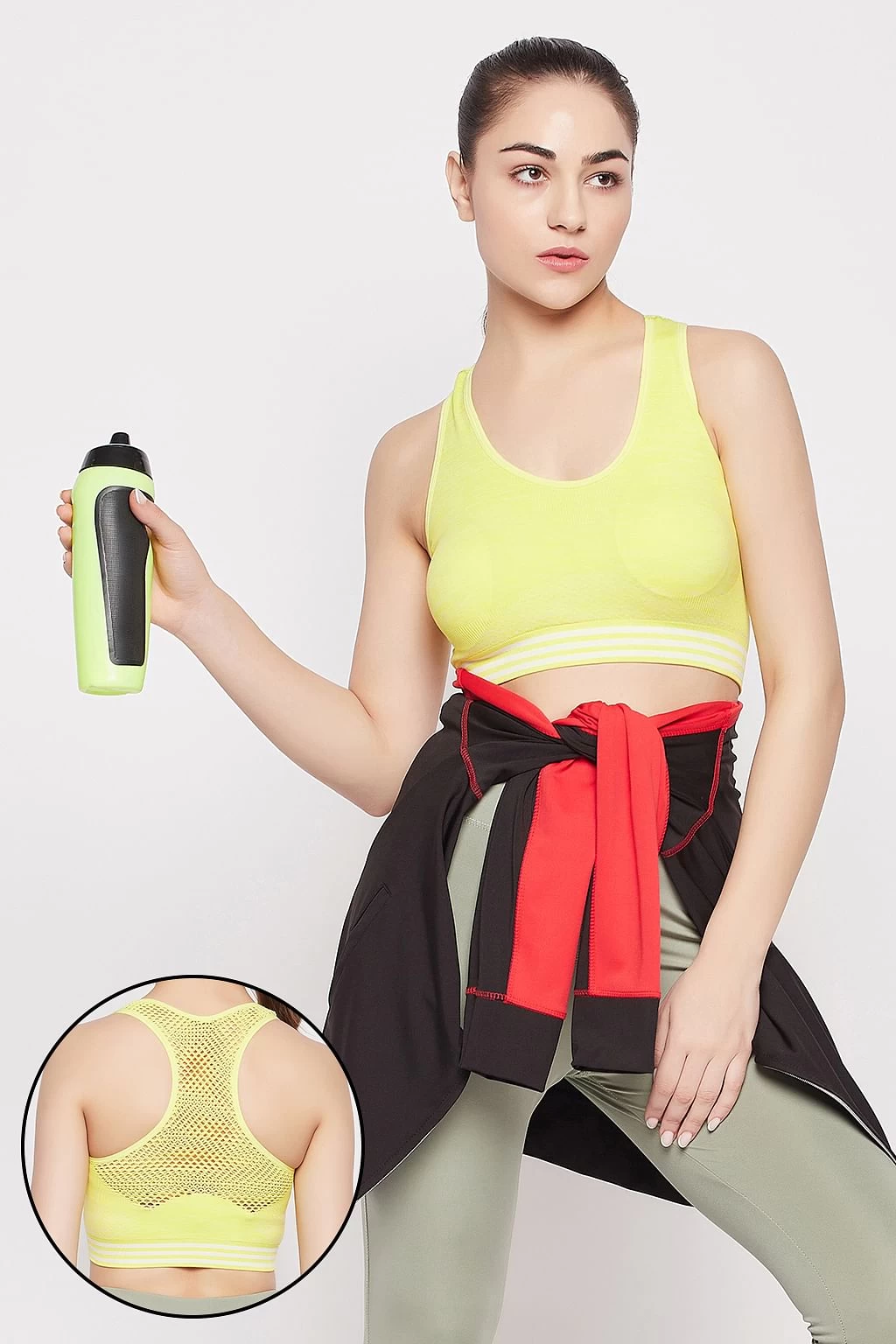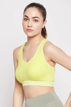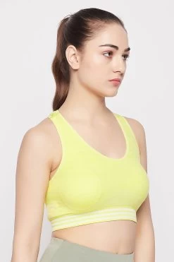 Lemon yellow colour sports bra crafted with soft moisture-wicking polyester spandex fabric.