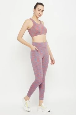 Medium Impact Padded Printed Active Sports Bra & High Rise Active Tights With Side Pocket In Purple