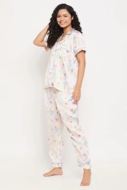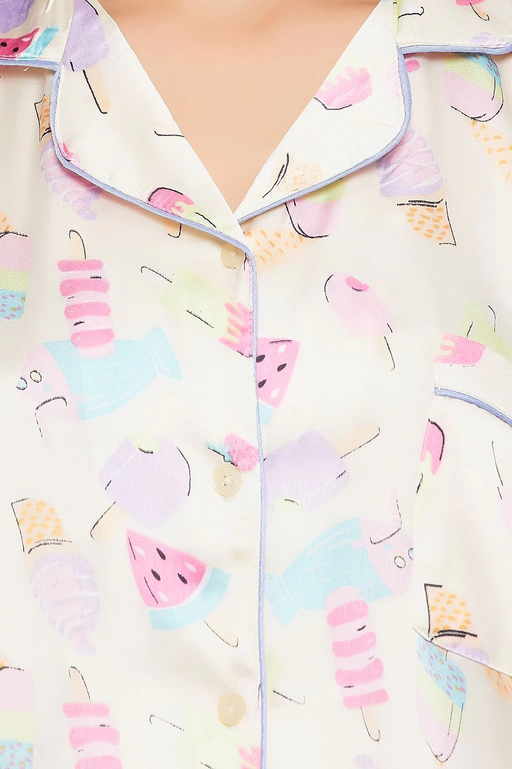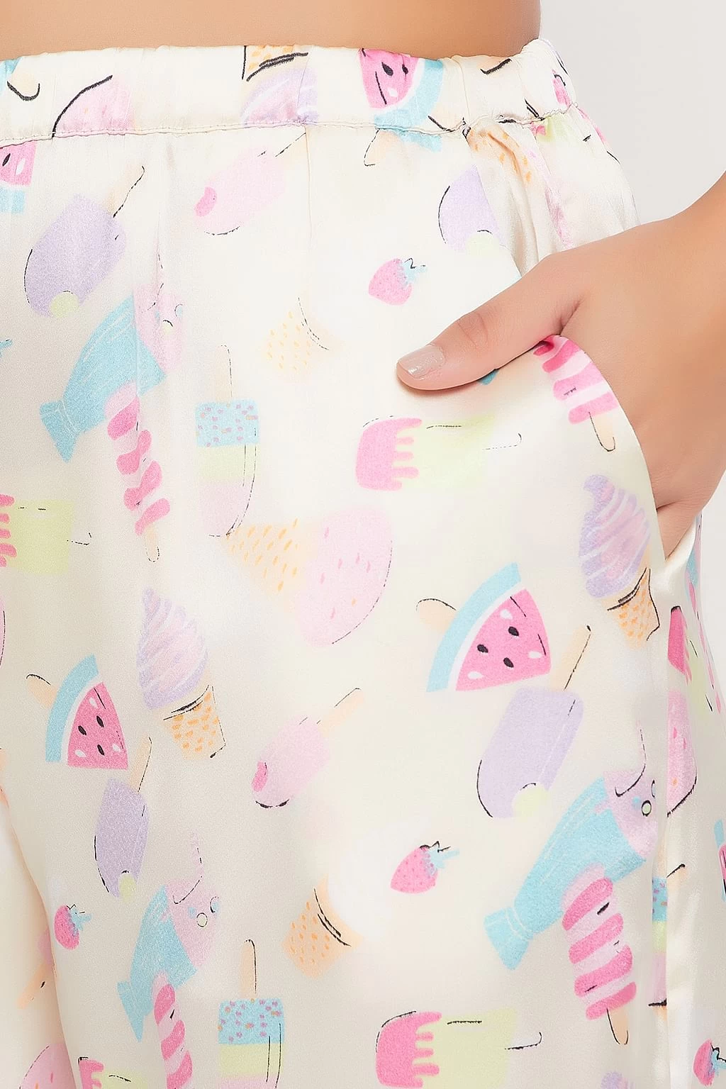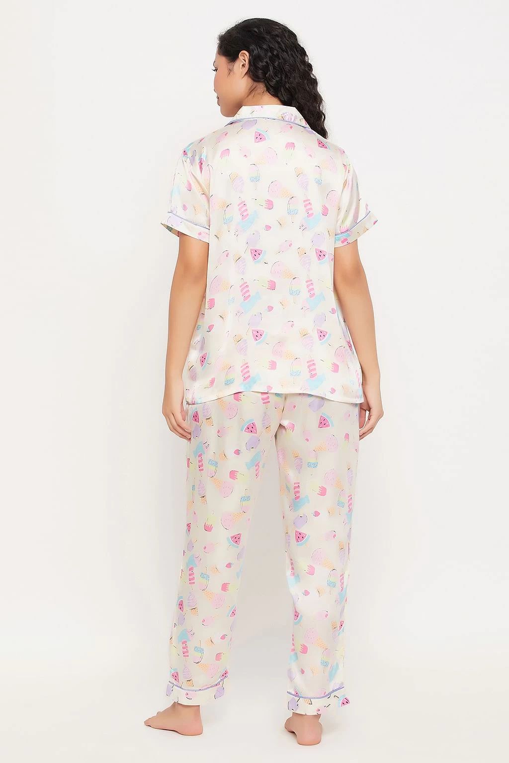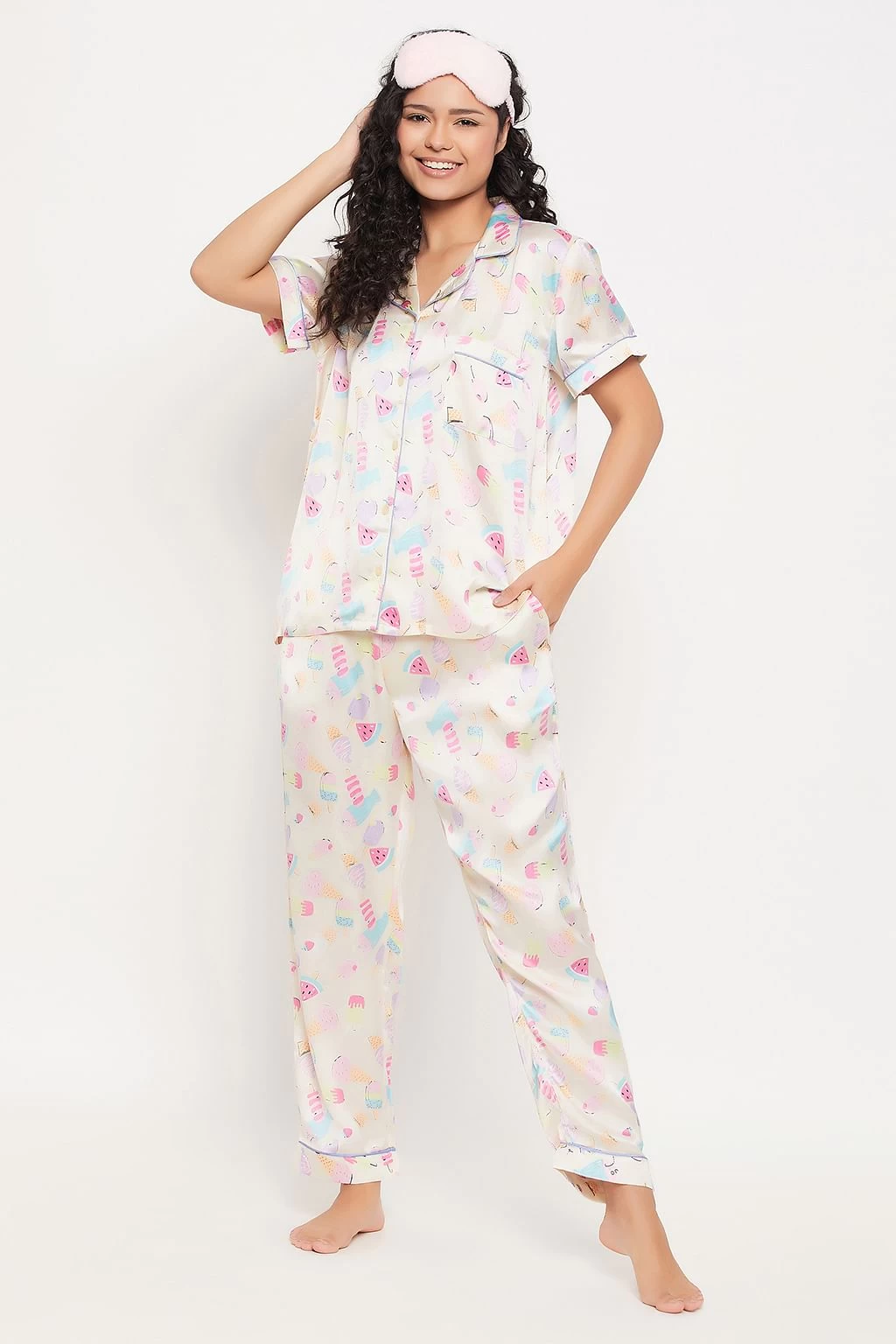 Midnight Cravings Button Down Shirt & Pyjama Set In Cream Colour – Satin