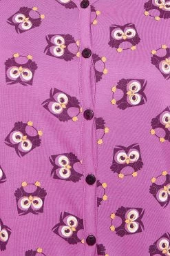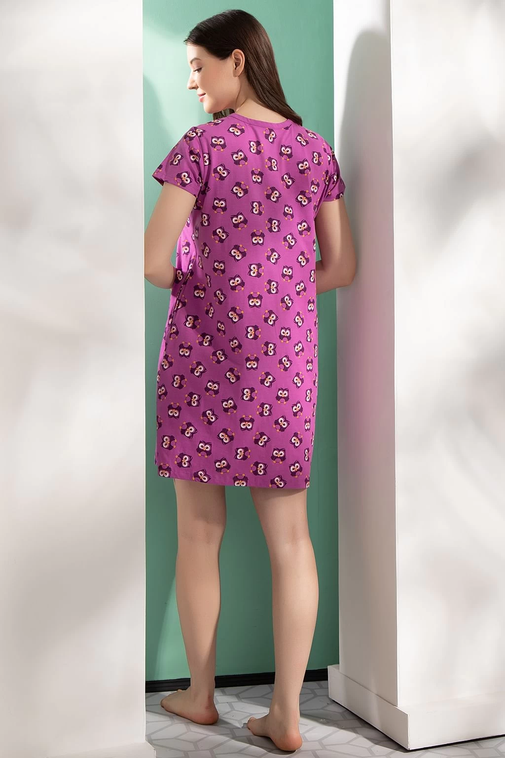 Owl Print Button Me Up Short Nightdress In Purple – 100% Cotton