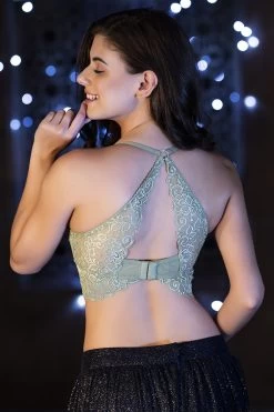 Sage green longline bralette crafted with intricate lace fabric & soft powernet fabric on cups.
