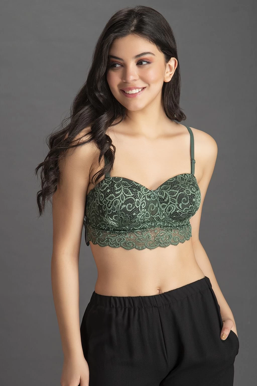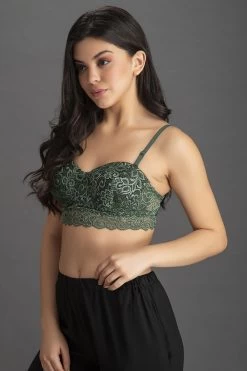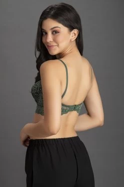 Bottle green bra crafted with lace and powernet.