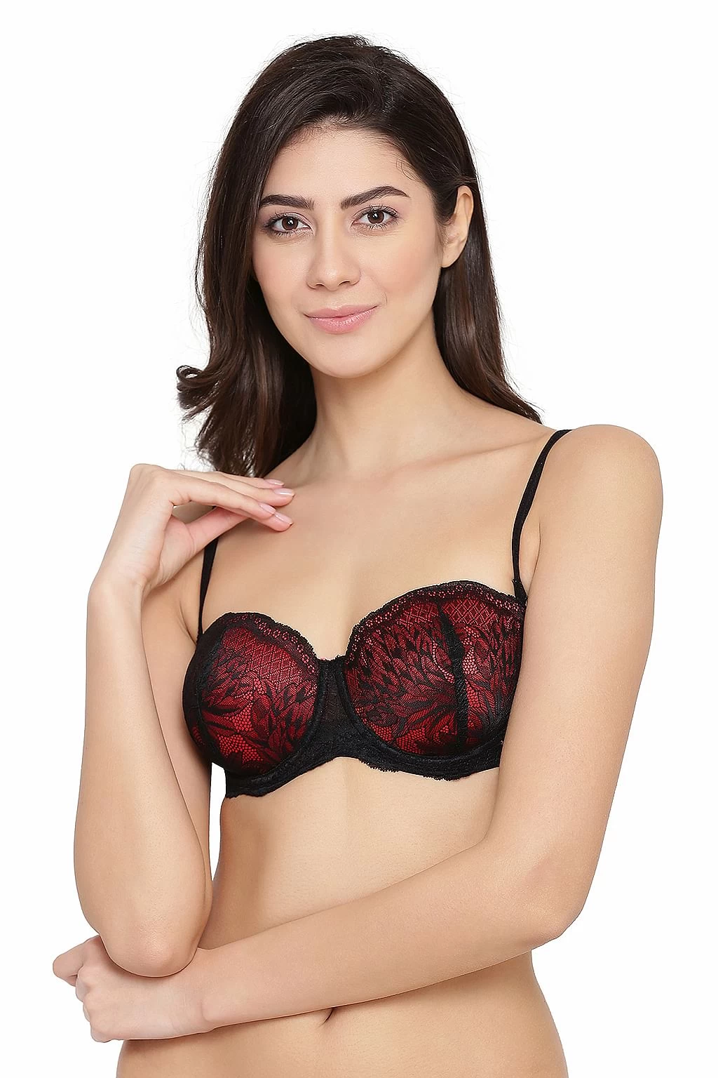 Black and Red printed bra crafted with lace and powernet. Padded cups to protect modesty. Underwired cups for a gentle lift. Balconette style for wide neck tops. Full coverage cups for no top or side spillage. Detachable straps to style the bra in multiple ways. Double/triple hook & eye in smaller/bigger cups respectively.