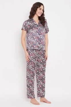 Pretty Florals Button Down Shirt & Pyjama Set In Sky Blue – Rayon