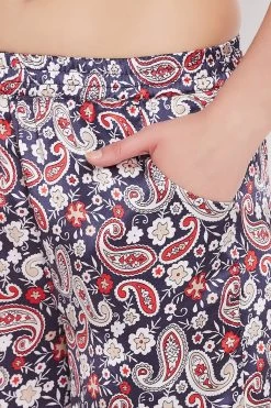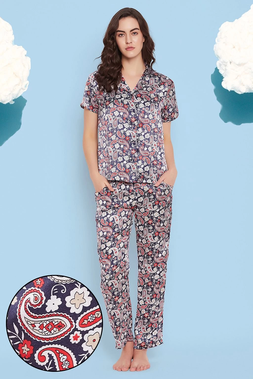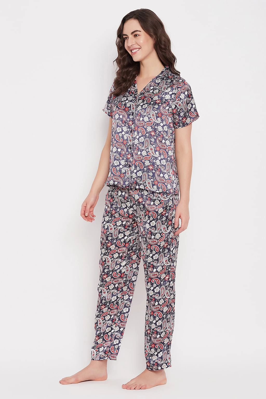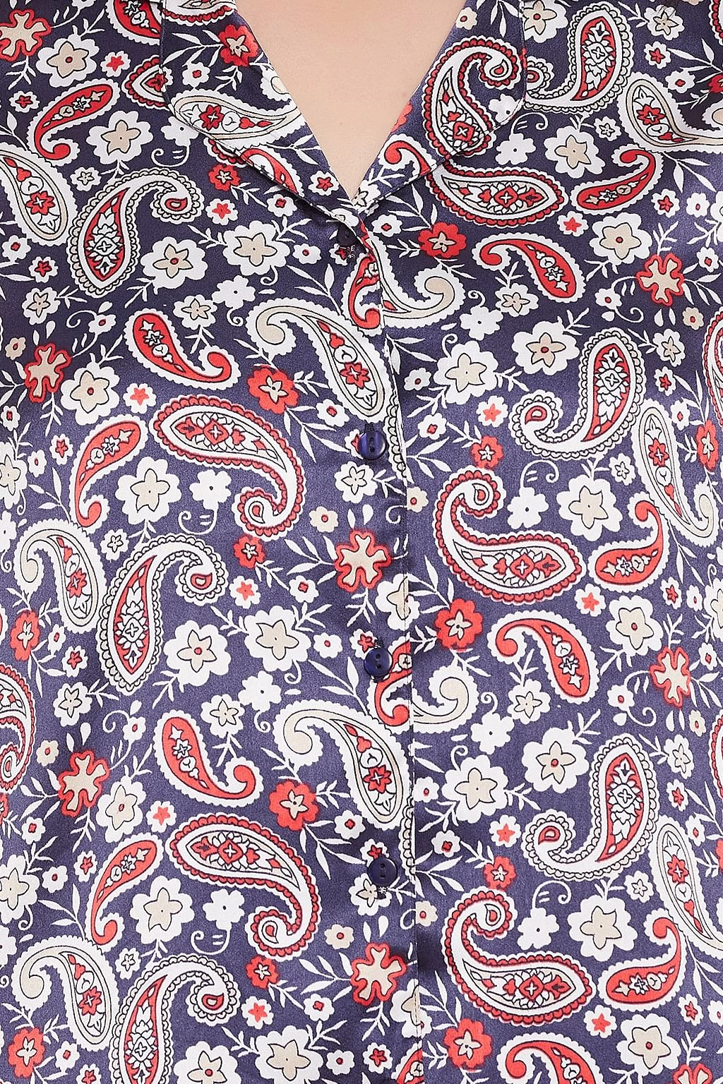 Paisley Print Button Down Shirt & Pyjama Set In Navy – Satin