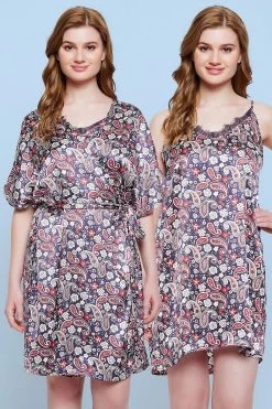 Paisley Print Short Night Dress & Robe Set In Navy – Satin