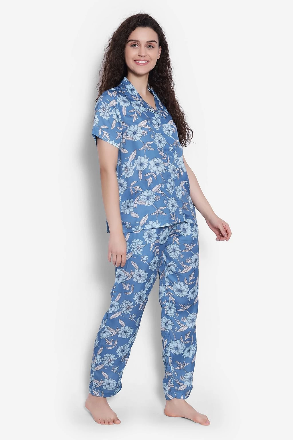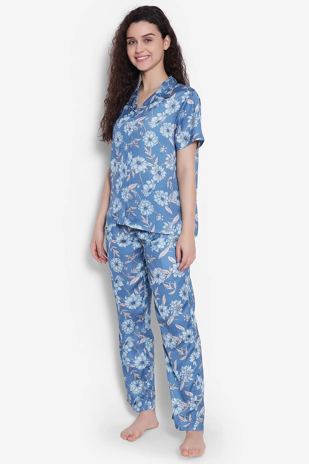 Powder blue button down shirt & pyjama set crafted with butter-soft & comfortable satin fabric.