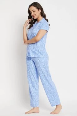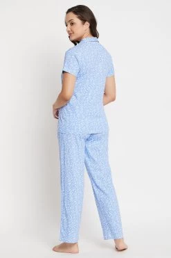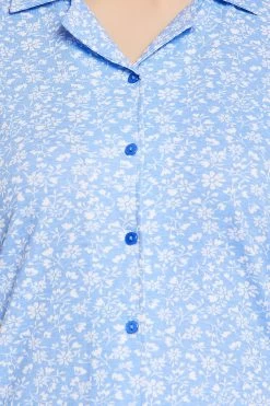 Pretty Florals Button Down Shirt & Pyjama Set In Baby Blue – 100% Cotton