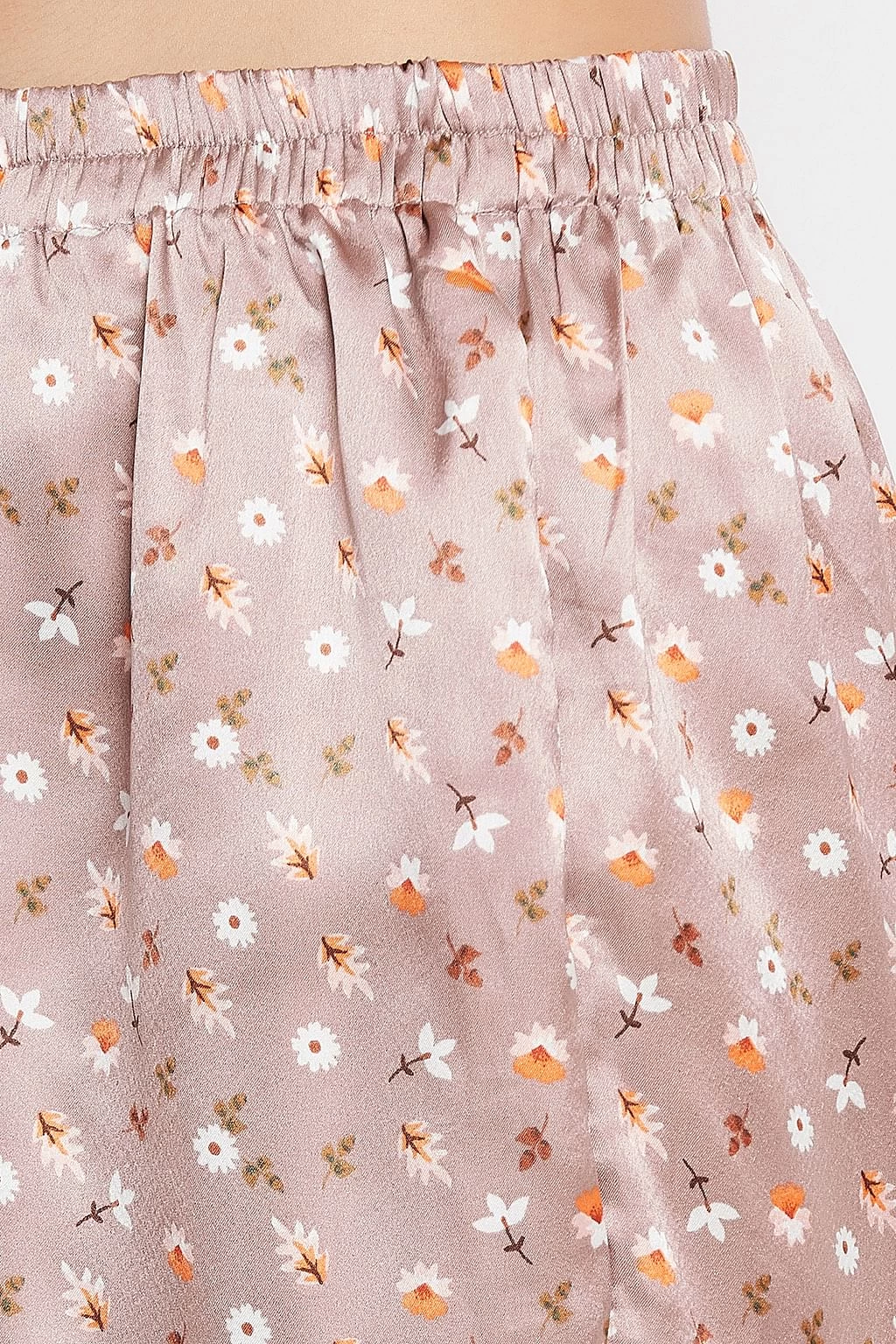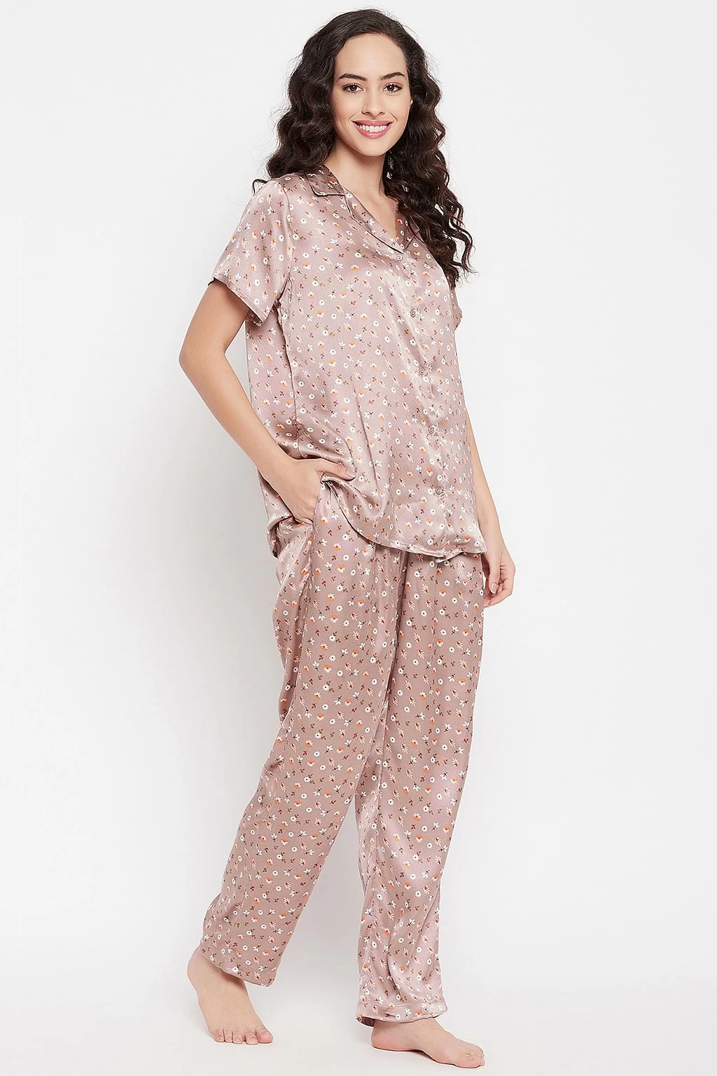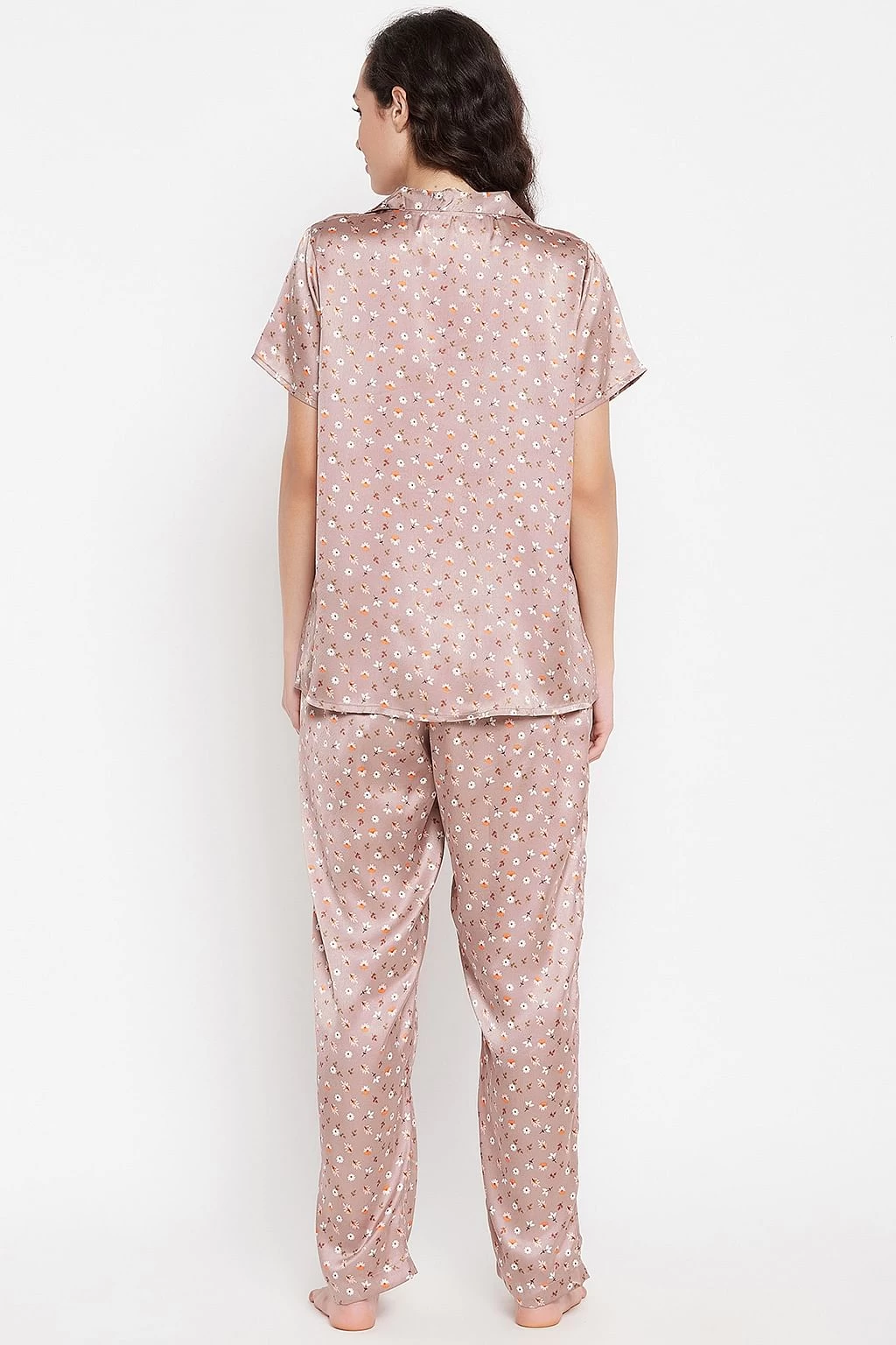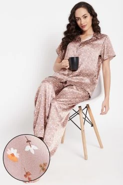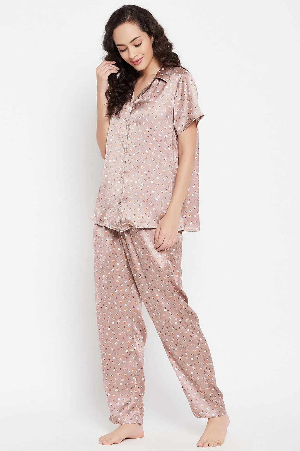 Pretty Florals Button Down Shirt & Pyjama Set In Brown – Satin