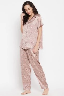 Brown button-down shirt & pyjama set crafted with butter-soft & comfortable satin fabric.