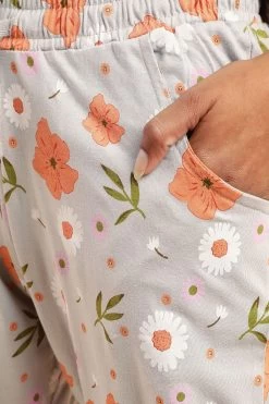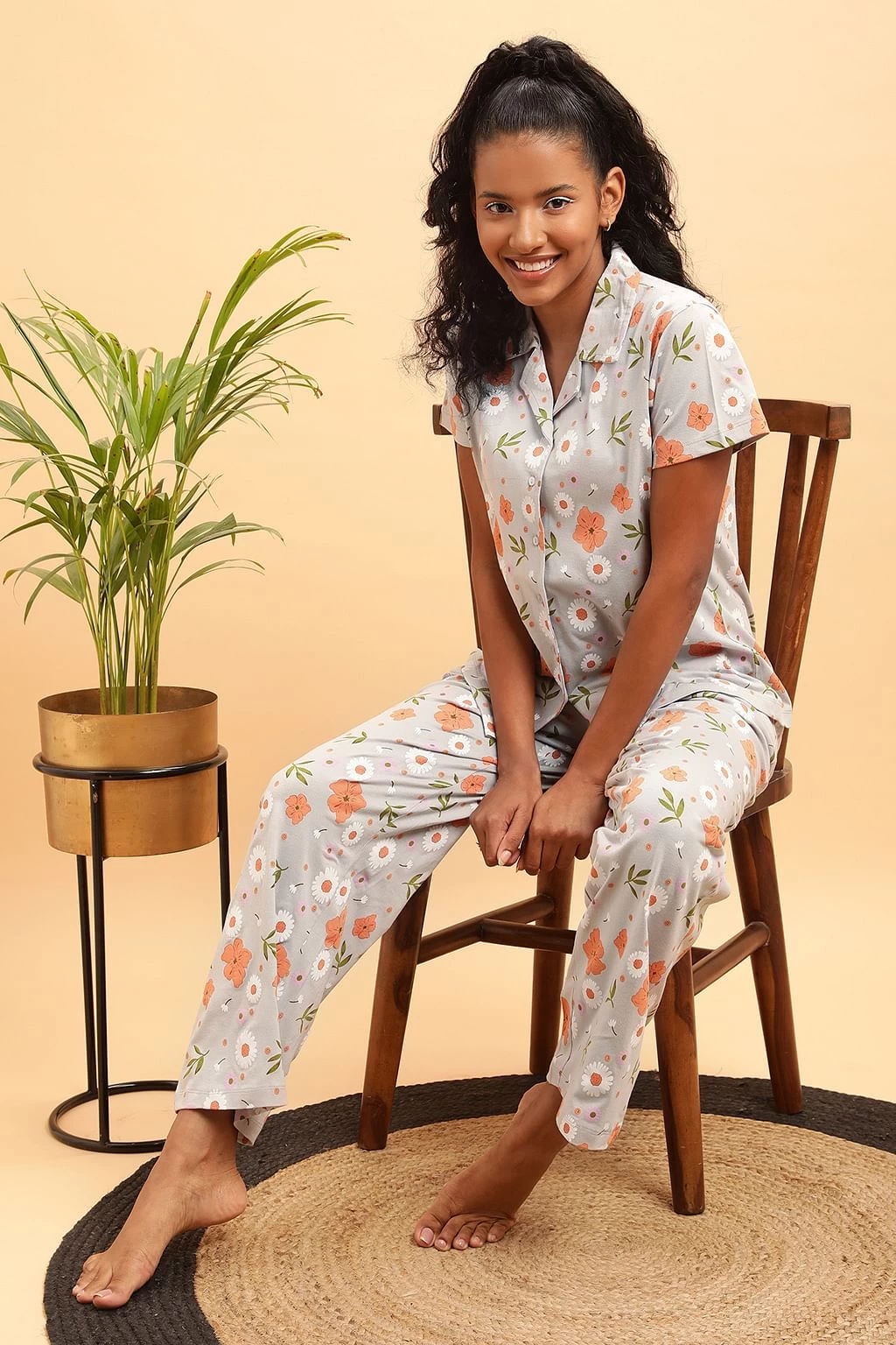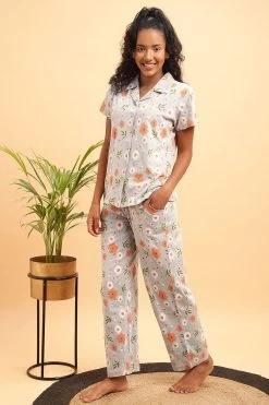 Pretty Florals Button Down Shirt & Pyjama Set In Grey – 100% Cotton