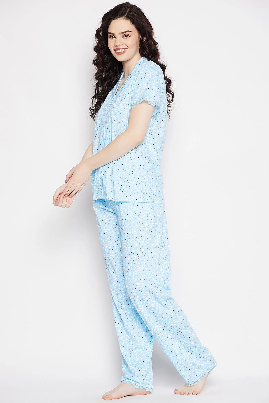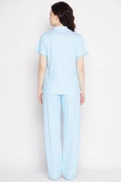 Sky blue button down shirt & pyjama set crafted with soft & lustrous modal fabric.